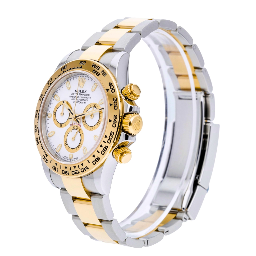 A bi-metal Rolex Cosmograph Daytona is presented in stainless steel and 18ct yellow gold, combining Rolex’s most celebrated chronograph design with enduring two-tone appeal. The 40mm Oyster case is fitted with a fixed yellow gold tachymeter bezel and paired with an Oyster bracelet featuring yellow gold centre links, creating a balanced mix of sport and luxury. The white dial offers excellent legibility, accented by gold-ringed sub-dials, applied baton hour markers, and the iconic red “Daytona” signature above the running seconds register.