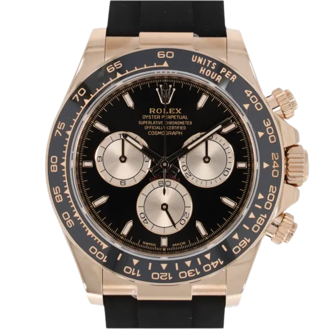 This 2025 Rolex Daytona reference 126515LN is presented in immaculate condition and features a full 18ct Everose gold case paired with a black Cerachrom tachymeter bezel. The 40mm case is complemented by the Oysterflex rubber strap with Everose gold clasp, delivering a balance of durability, comfort, and modern sport-luxury appeal. The black dial with contrasting sub-dials offers crisp legibility while maintaining the Daytona’s unmistakable, performance-driven aesthetic.