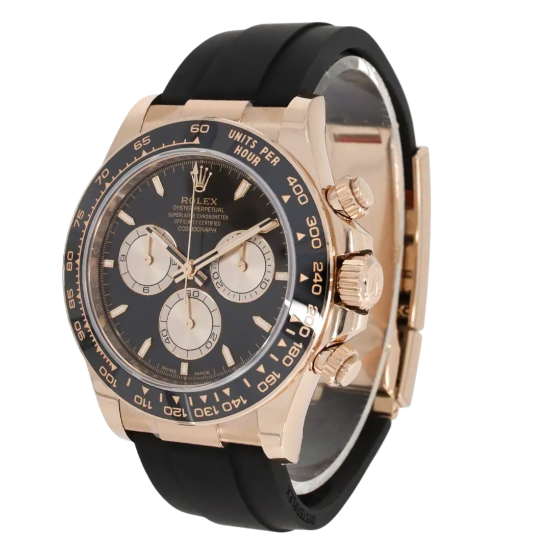 A Rolex Daytona Watch, Black Rubber Strap with 18ct Rose Gold Case and Clasp with a Black Bezel and a Black Dial.