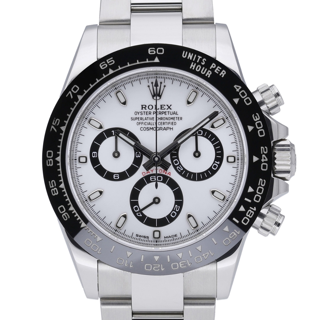 A Rolex Daytona Watch, Stainless Steel with a Black Bezel on a White Dial