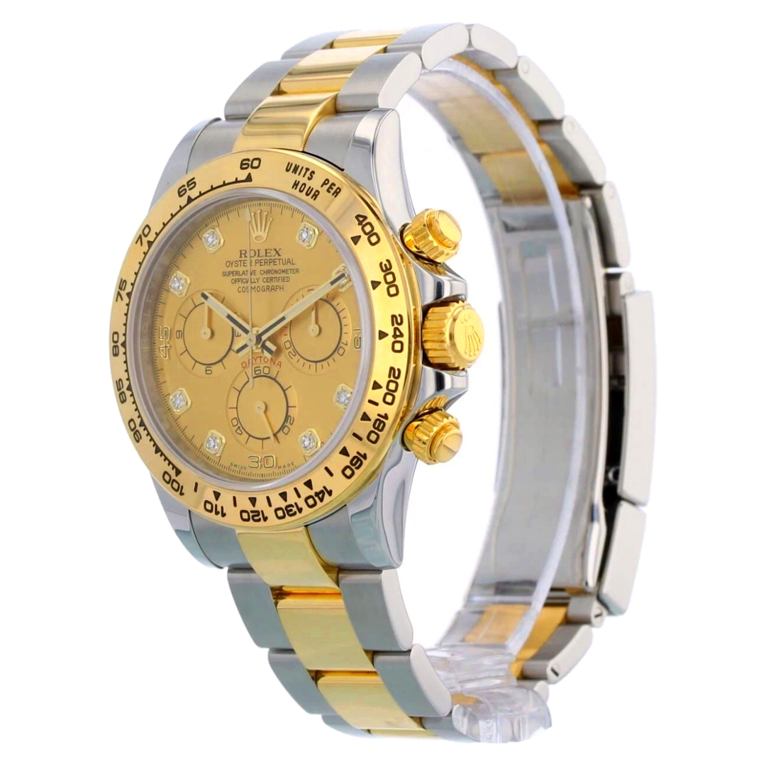 This Rolex Daytona 116503 represents one of the most recognisable and liquid chronographs in the modern luxury market. Crafted in stainless steel and 18ct yellow gold, it features the iconic champagne dial set with original Rolex diamond hour markers, paired with the fixed yellow gold tachymeter bezel that defines the Daytona lineage.