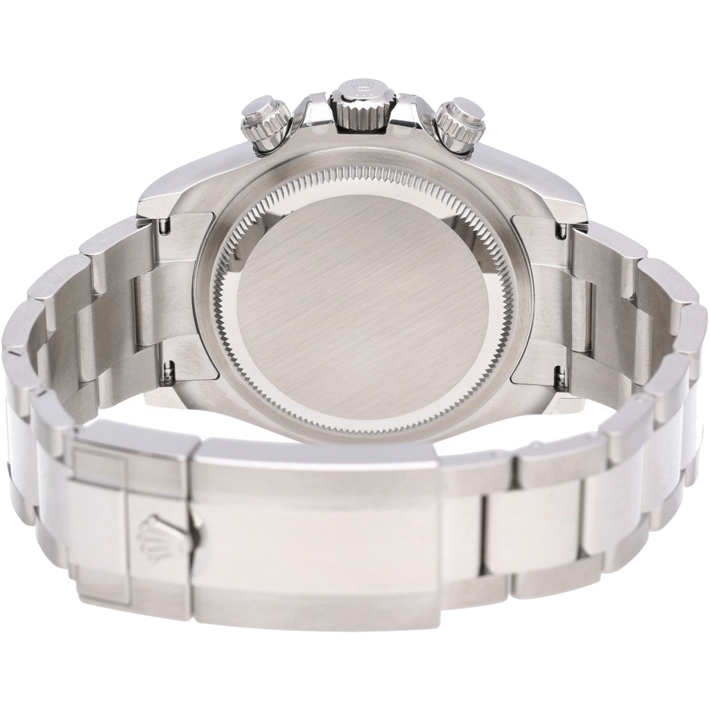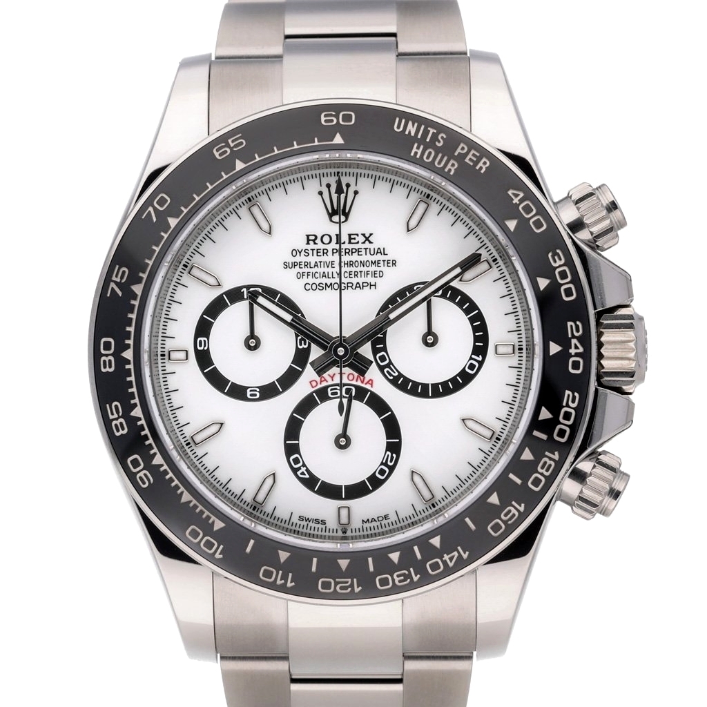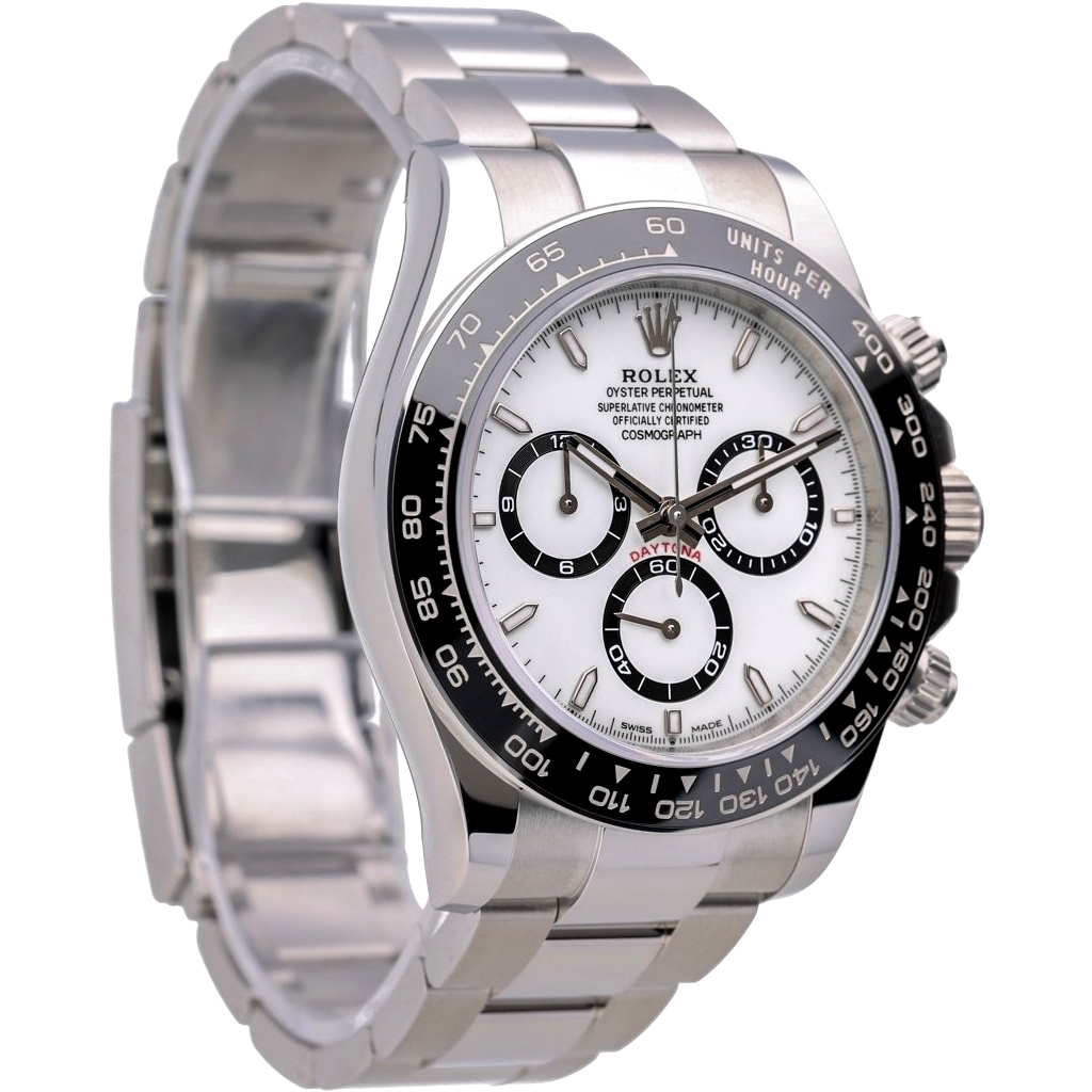 A Rolex Daytona Watch, Stainless Steel with a Black Bezel and a White Dial.