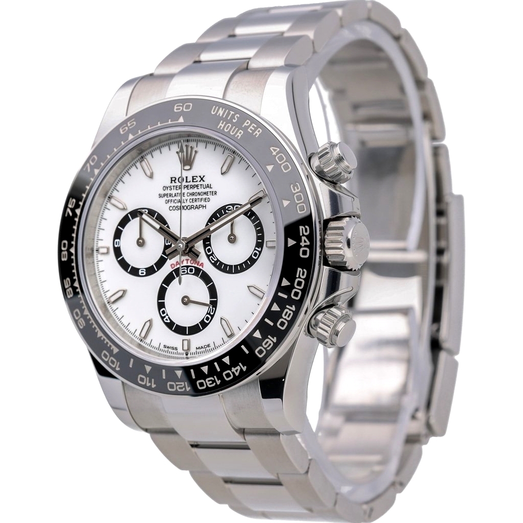 A Rolex Daytona, model 126500LN, presented in immaculate condition. This 2024 reference is crafted in stainless steel, featuring the black Cerachrom tachymeter bezel and crisp white dial with contrasting black sub-dials. The 40mm case is fitted to the Oyster bracelet and powered by the Rolex Calibre 4131 automatic movement, delivering exceptional chronometric performance. Supplied with its original full set of paperwork, presentation box, and Rolex manufacturer warranty remaining until 2029.