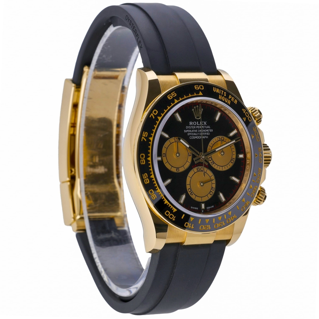A Rolex Cosmograph Daytona reference 126518LN in 18ct yellow gold, fitted with a black Oysterflex rubber strap and a black Cerachrom tachymeter bezel, presented as a complete full set with the Rolex manufacturer's warranty remaining until 2030. The 40mm yellow-gold case delivers a strong wrist presence, while the black dial with contrasting gold-ringed sub-dials and red Daytona script maintains the model’s unmistakable racing identity.