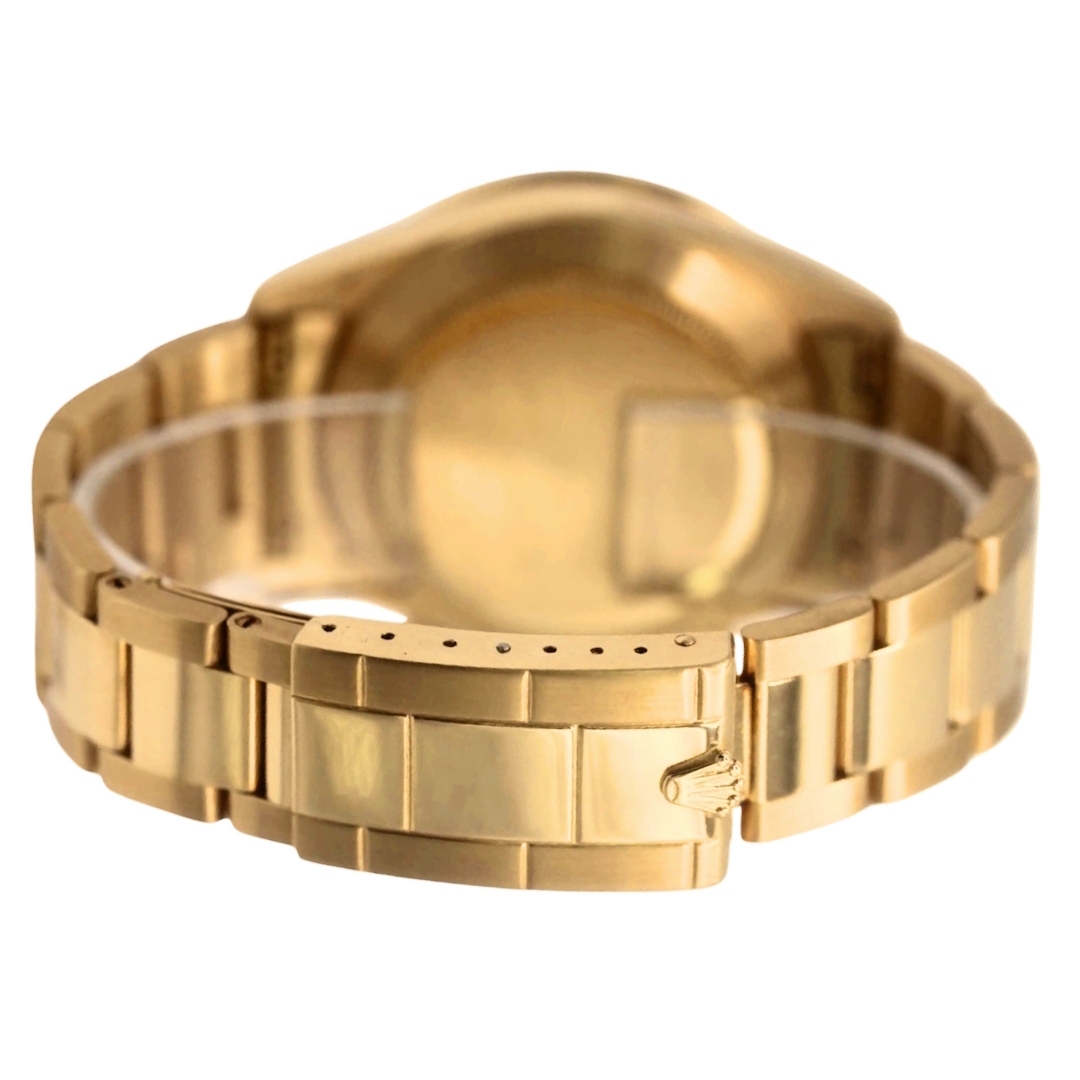 A Rolex Cosmograph Daytona reference 16528 in full 18ct yellow gold, featuring a 40mm Oyster case and a matching gold tachymeter bezel, delivering unmistakable presence on the wrist. The black dial is sharply contrasted with champagne sub-dials, creating the highly sought-after “Paul Newman-inspired” aesthetic, with applied hour markers and chronograph registers that offer both clarity and depth.