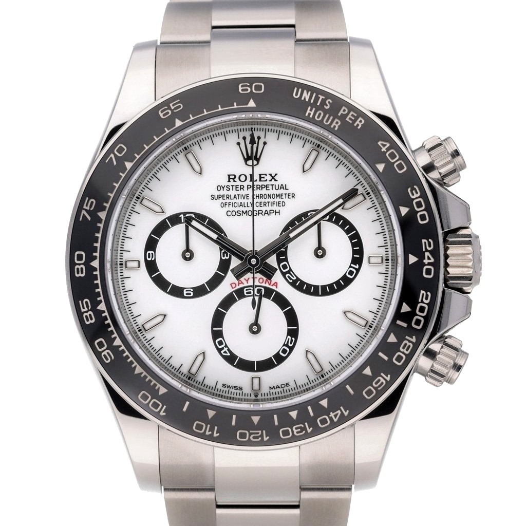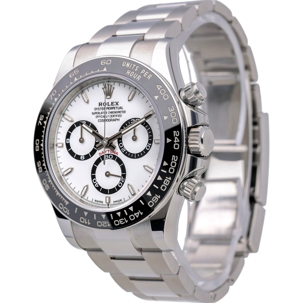 A Rolex Cosmograph Daytona reference 126500LN in stainless steel, presented with the iconic white “panda” dial and contrasting black Cerachrom bezel. As the latest evolution of one of Rolex’s most celebrated chronographs, this model refines an already legendary design with subtle updates that enhance both aesthetics and performance.