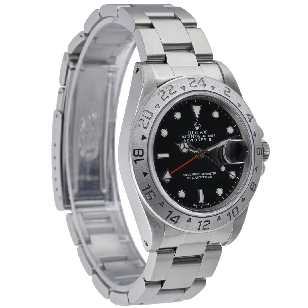 A Rolex Explorer II from 1993 is a classic example of Rolex’s purpose-built tool watch design, originally developed for spelunkers and explorers operating in low-light environments. The 40mm stainless steel case is paired with a clean black dial, fixed 24-hour bezel, and the signature orange GMT hand, offering excellent legibility and timeless functionality.