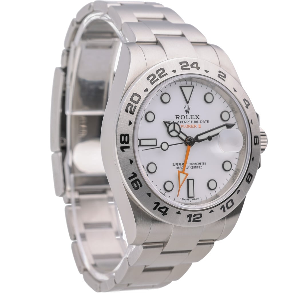 This Rolex Explorer II reference 216570 is a robust, highly legible professional model designed for extreme environments and long-range exploration. The 42mm stainless steel Oyster case offers strong wrist presence while remaining balanced and wearable, complemented by the fixed brushed steel 24-hour bezel. The crisp white dial provides exceptional contrast, enhanced by bold luminous hour markers and the signature orange 24-hour hand that defines the Explorer II lineage.