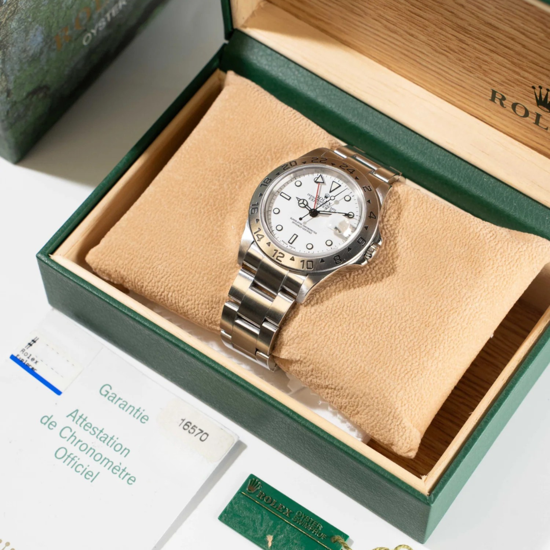 A Rolex Explorer II reference 16570 in stainless steel, presented with the highly sought-after white “Polar” dial and classic 40mm Oyster case. The fixed 24-hour engraved bezel and distinctive red GMT hand reinforce its tool-watch heritage, originally designed for explorers operating in extreme environments. The crisp black-outlined hour markers and Mercedes hands provide excellent contrast against the white dial, creating one of the most recognisable sports Rolex configurations of the modern era.