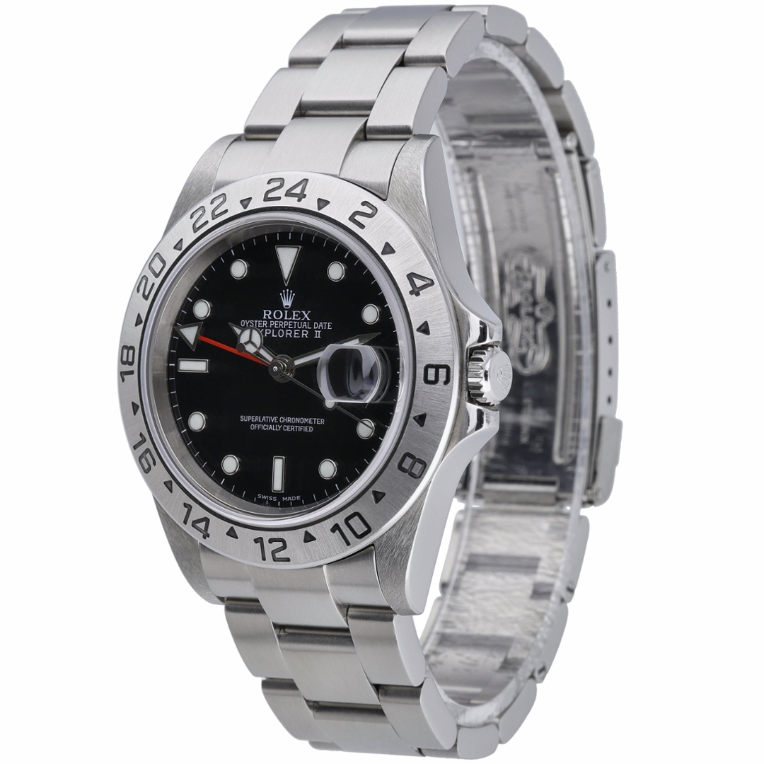 A Rolex Explorer II Watch that embodies rugged sophistication and adventure-ready reliability, this 2004 model 16570 is a genuine tool watch with timeless appeal. Crafted in stainless steel with a 40mm case, it features a crisp fixed 24-hour bezel and a striking black dial, designed for optimal readability in extreme conditions.