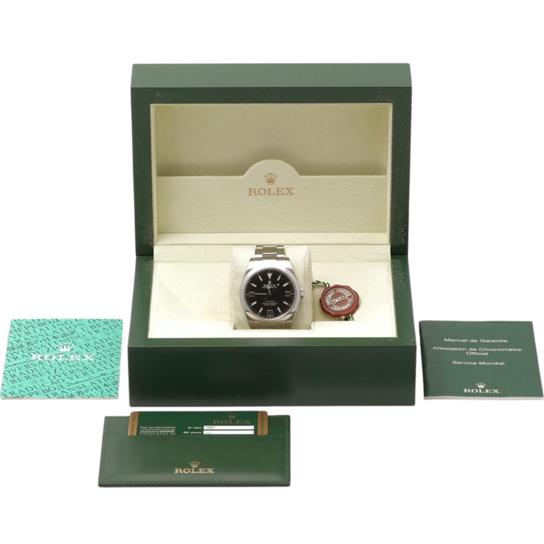 The black dial features the signature 3, 6, and 9 Arabic numerals, along with luminous hour markers and Mercedes-style hands, ensuring excellent legibility in all conditions. The smooth stainless steel bezel and robust Oyster bracelet enhance the watch’s clean, utilitarian aesthetic—crafted for explorers, yet refined enough for everyday wear.