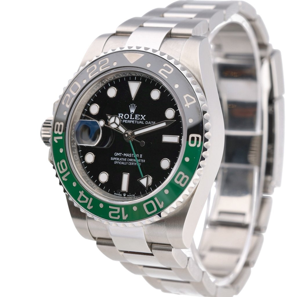 A Rolex GMT-Master II "Sprite", model 126720VTNR, is a striking and innovative timepiece known for its distinctive green and black Cerachrom bezel. Released in 2022, this model features a 40mm stainless steel Oyster case, offering exceptional durability and water resistance up to 100 meters. The black dial is adorned with luminescent hour markers and features a left-sided crown, a unique design element that distinguishes this "Destro" model. The green 24-hour hand allows for dual-time zone tracking, catering to global travellers.