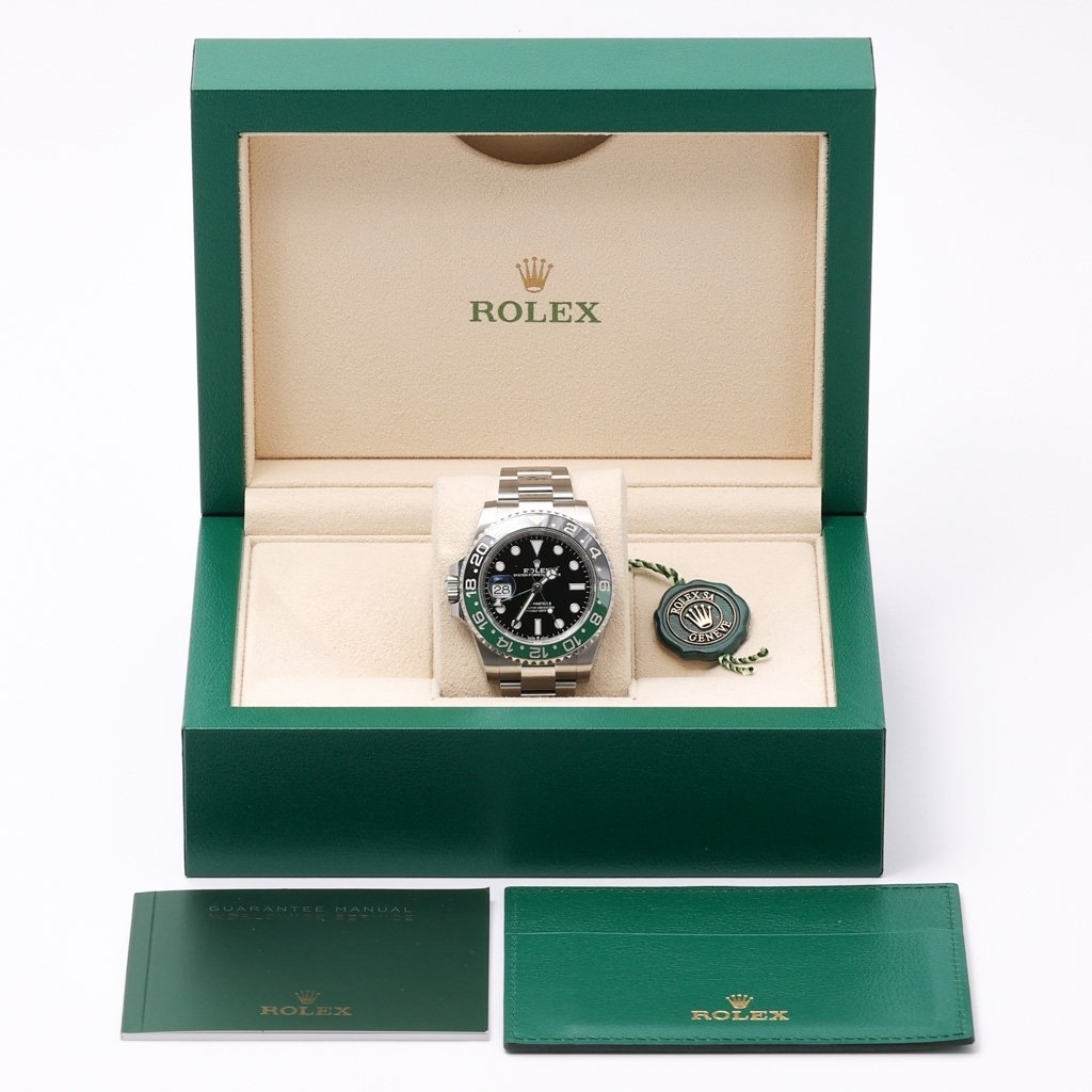 This immaculate timepiece is accompanied by its original complete set of paperwork, is boxed and certified, and includes the Rolex manufacturer's warranty valid until 2028. The green and black bezel adds a bold, modern twist to the classic GMT-Master II, making it a highly desirable addition for collectors and enthusiasts.