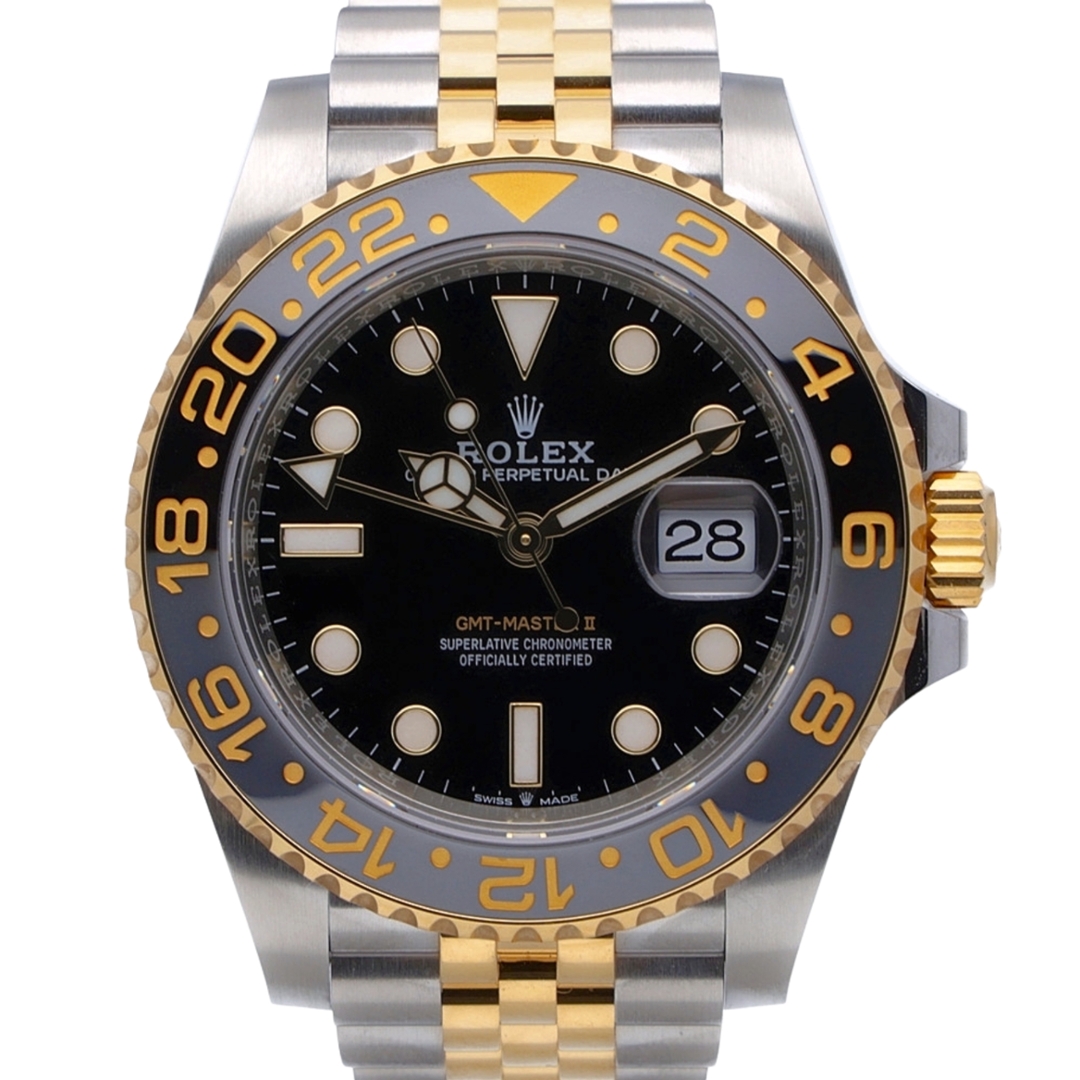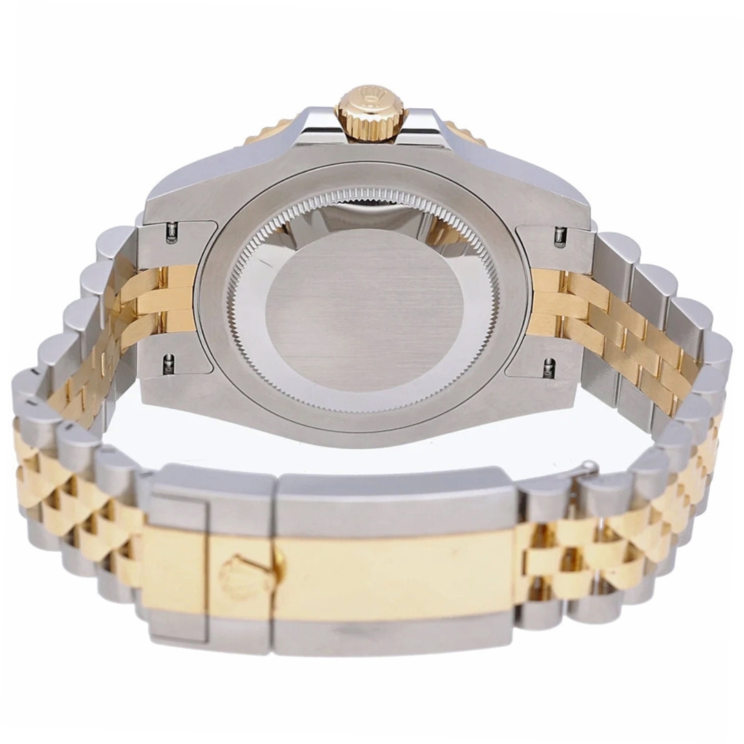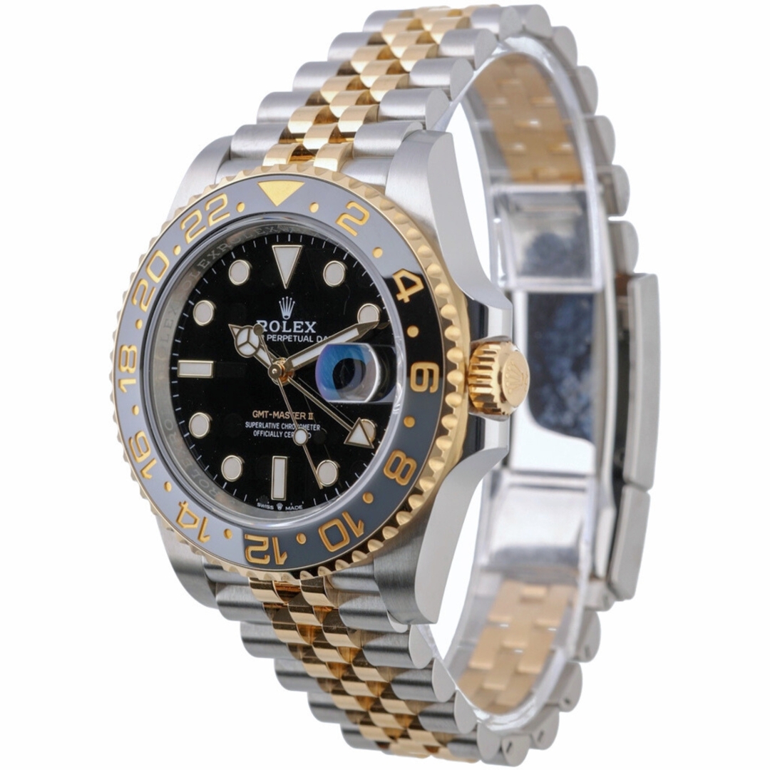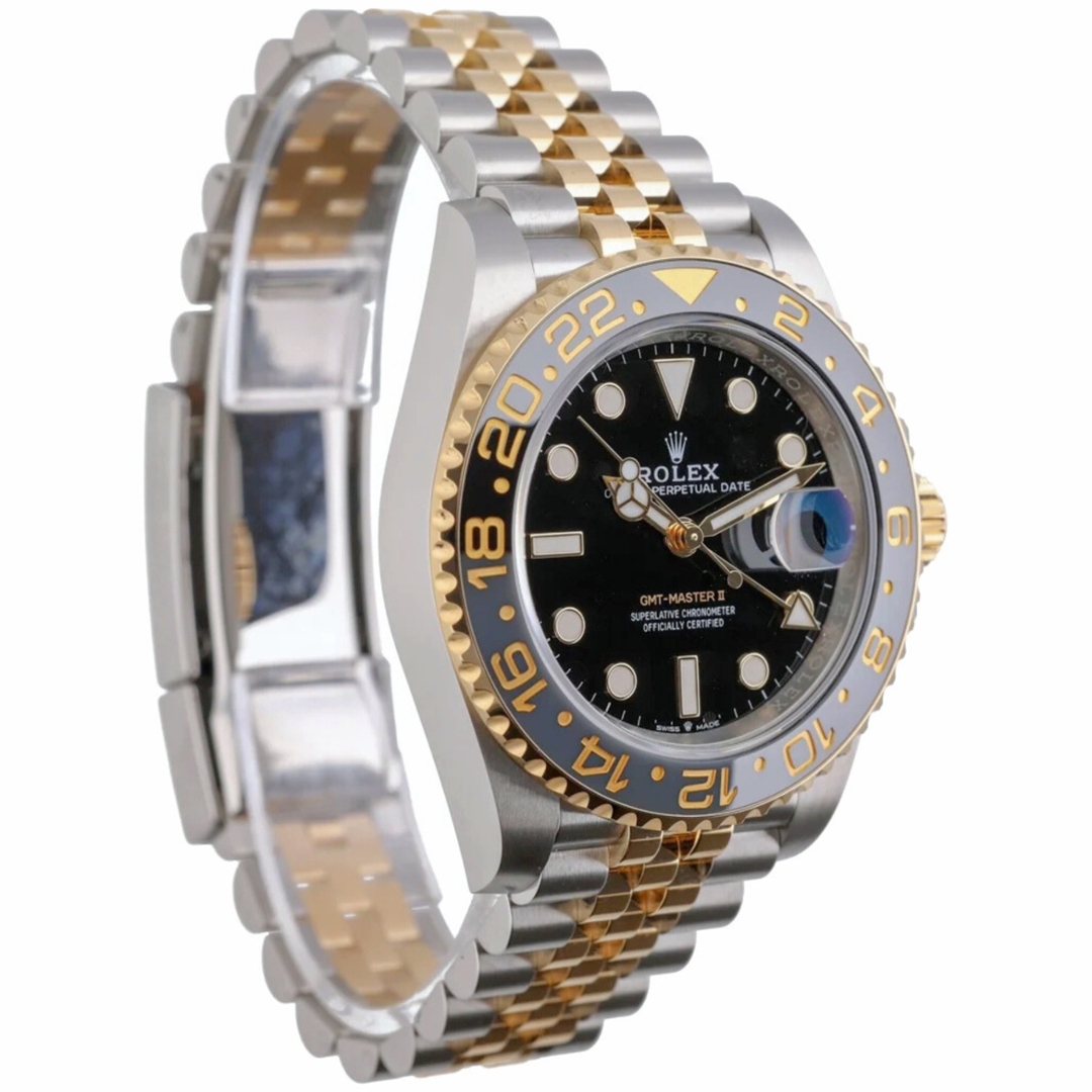 A Rolex GMT-Master II, model 126713GRNR, is a stunning bi-metal timepiece from 2024, featuring a combination of stainless steel and 18ct yellow gold. This immaculate 40mm watch features an elegant black-and-grey bezel and a black dial, making it perfect for any occasion.