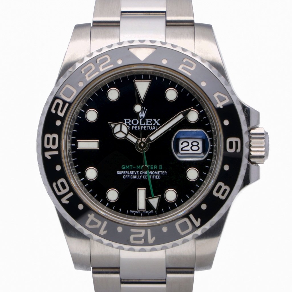 Powered by the Rolex Calibre 3186 automatic movement, the 116710LN provides exceptional accuracy, a 50-hour power reserve, and dual-time zone functionality — making it a favourite among frequent travellers and collectors. The green 24-hour hand, luminous hour markers, and robust construction highlight the GMT-Master II’s commitment to durability, legibility, and performance.