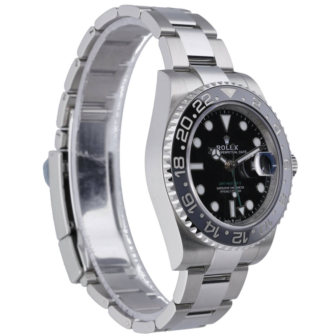 A Rolex GMT-Master II Watch, Stainless Steel with a Black/Grey Bezel on a Black Dial