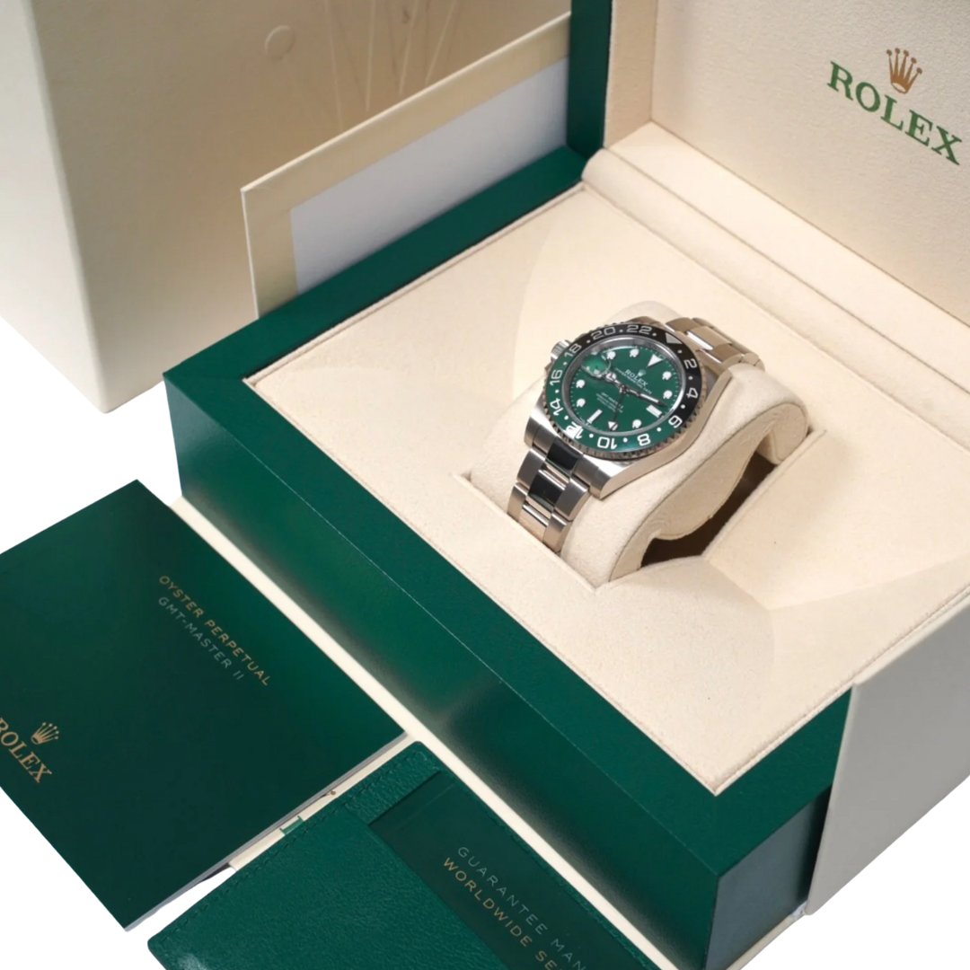 As a modern reinterpretation of the GMT-Master II, this reference combines precious-metal construction with bold contemporary styling. The 40mm case provides a confident yet wearable presence, while the green dial introduces a striking aesthetic that differentiates this model within the collection.