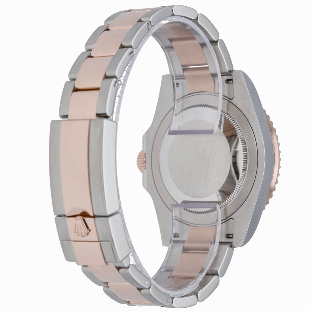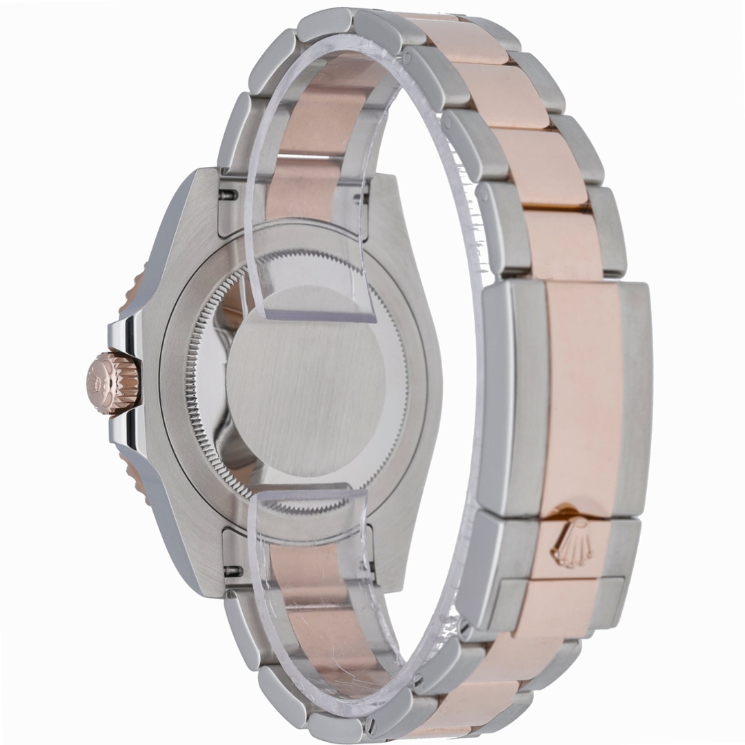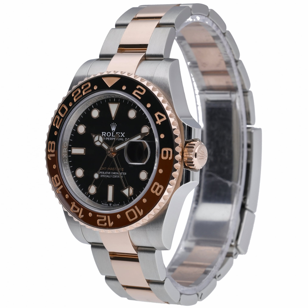 This bi-metal Rolex GMT-Master II reference 126711CHNR features the 40mm Oyster case in stainless steel, paired with 18ct Everose gold across the bezel, crown, and centre bracelet links. The black and brown Cerachrom bezel features a clear 24-hour scale, while the black dial is fitted with luminous hour markers, Mercedes hands, and the signature GMT hand for dual-time zone tracking. A sapphire crystal with cyclops date magnification completes the familiar professional layout.