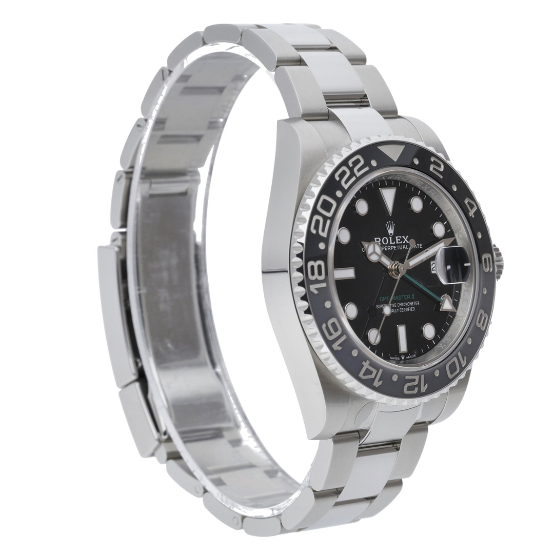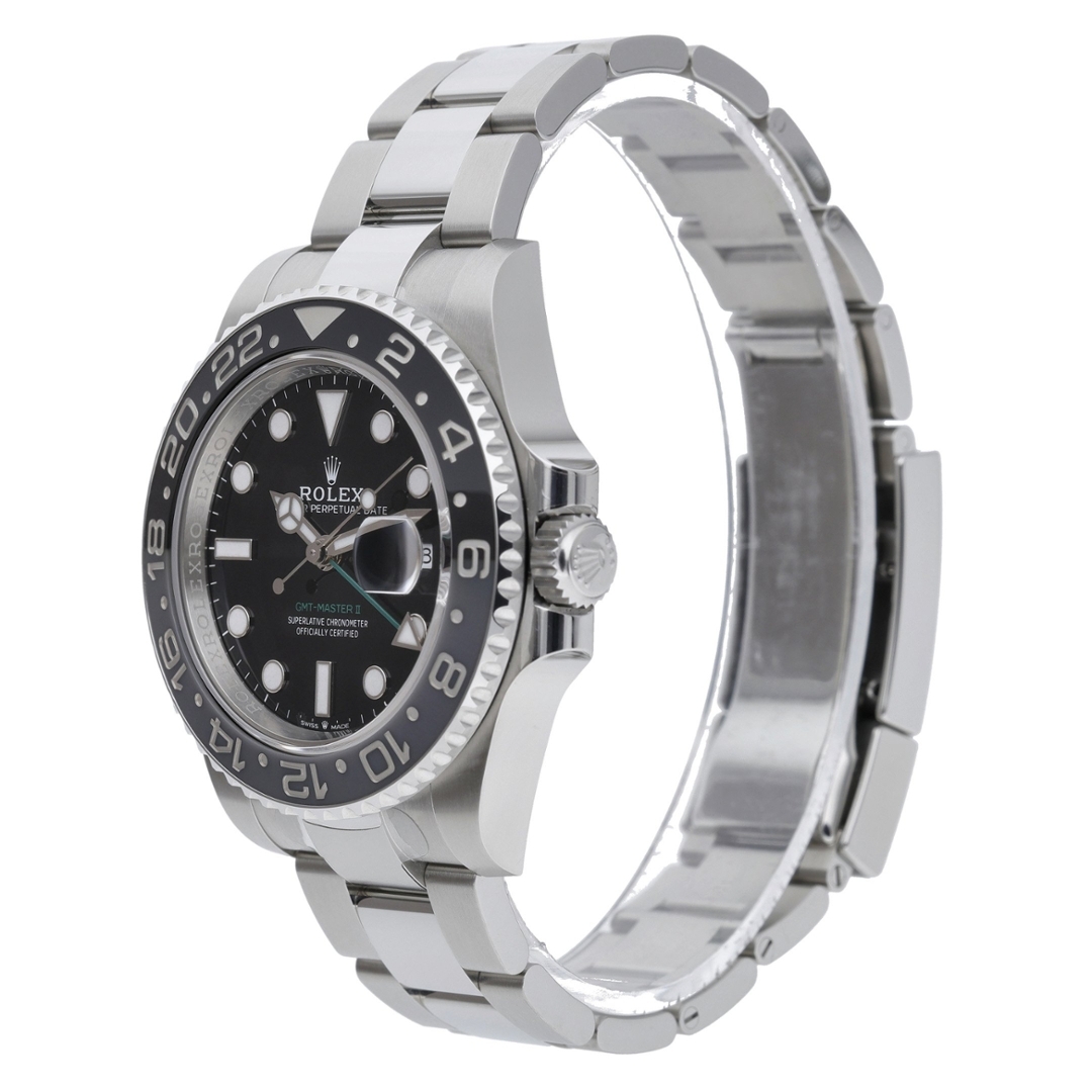 This Rolex GMT-Master II reference 126710GRNR is presented in stainless steel with the distinctive black and grey Cerachrom bezel, paired with a classic black dial. Released in 2024, this modern GMT introduces a more understated, monochrome aesthetic while retaining the unmistakable DNA of the GMT-Master line. The 40mm Oyster case offers balanced proportions and everyday versatility, equally suited to travel or daily wear.
