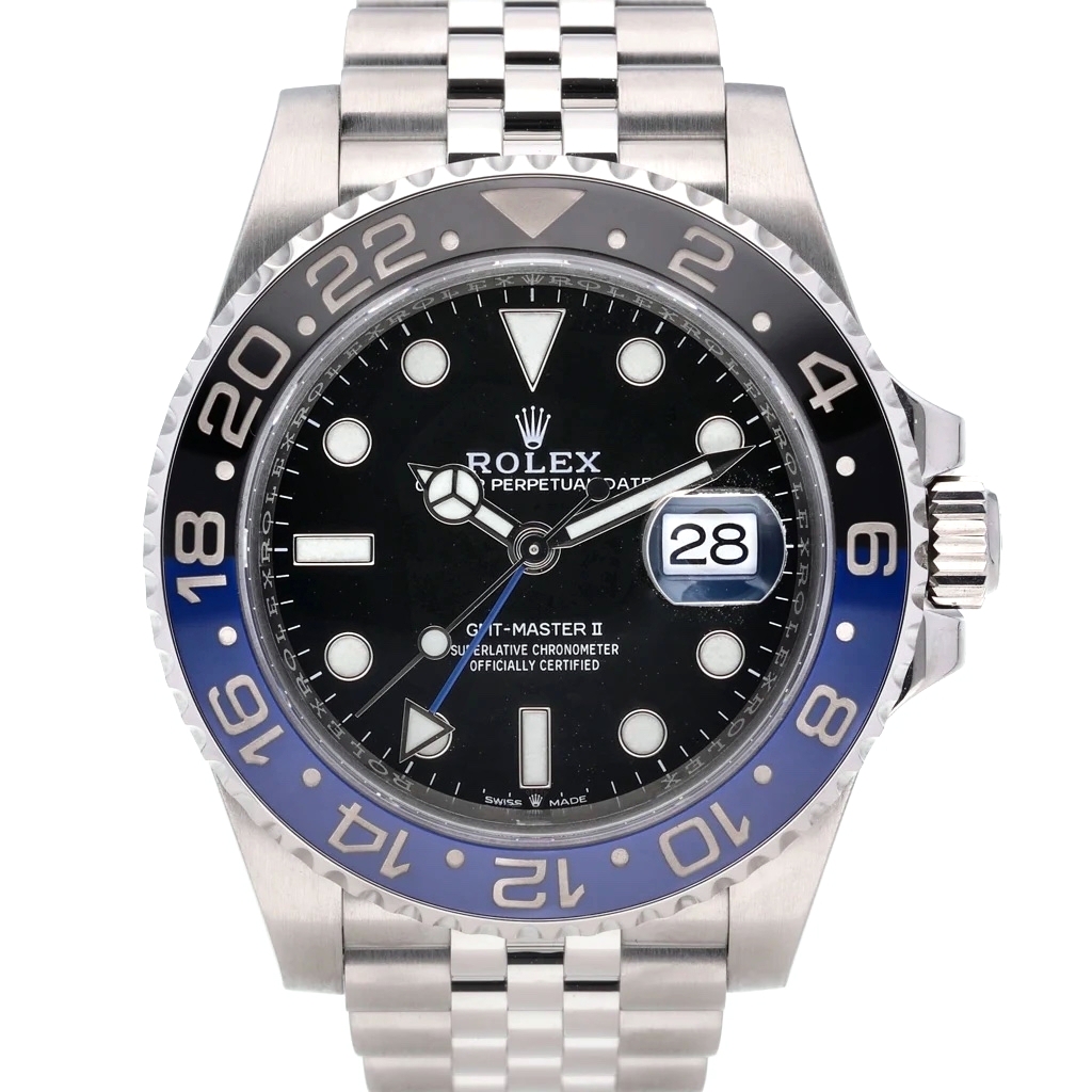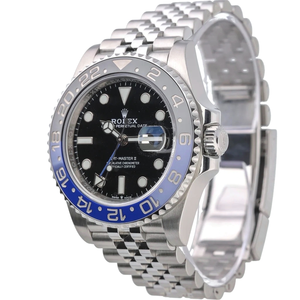 A Rolex GMT-Master II Watch, model 126710BLNR, constructed in stainless steel with the highly coveted black and blue “Batman” bezel and a sleek black dial. This 2026 release features a 40mm case and Rolex’s automatic movement, calibre 3285, offering superior timekeeping, dual-time zone tracking, and a 70-hour power reserve.