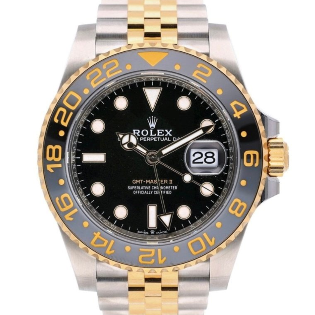 This bi-metal Rolex GMT-Master II reference 126713GRNR is a striking modern release that blends classic Rolex luxury with contemporary sports watch appeal. Crafted from stainless steel and 18ct yellow gold, the 40mm Oyster case is paired with a matching two-tone bracelet and a distinctive black-and-grey Cerachrom bezel. The black dial provides a sharp, high-contrast backdrop for the luminous hour markers and signature GMT hand, creating a confident and instantly recognisable aesthetic.