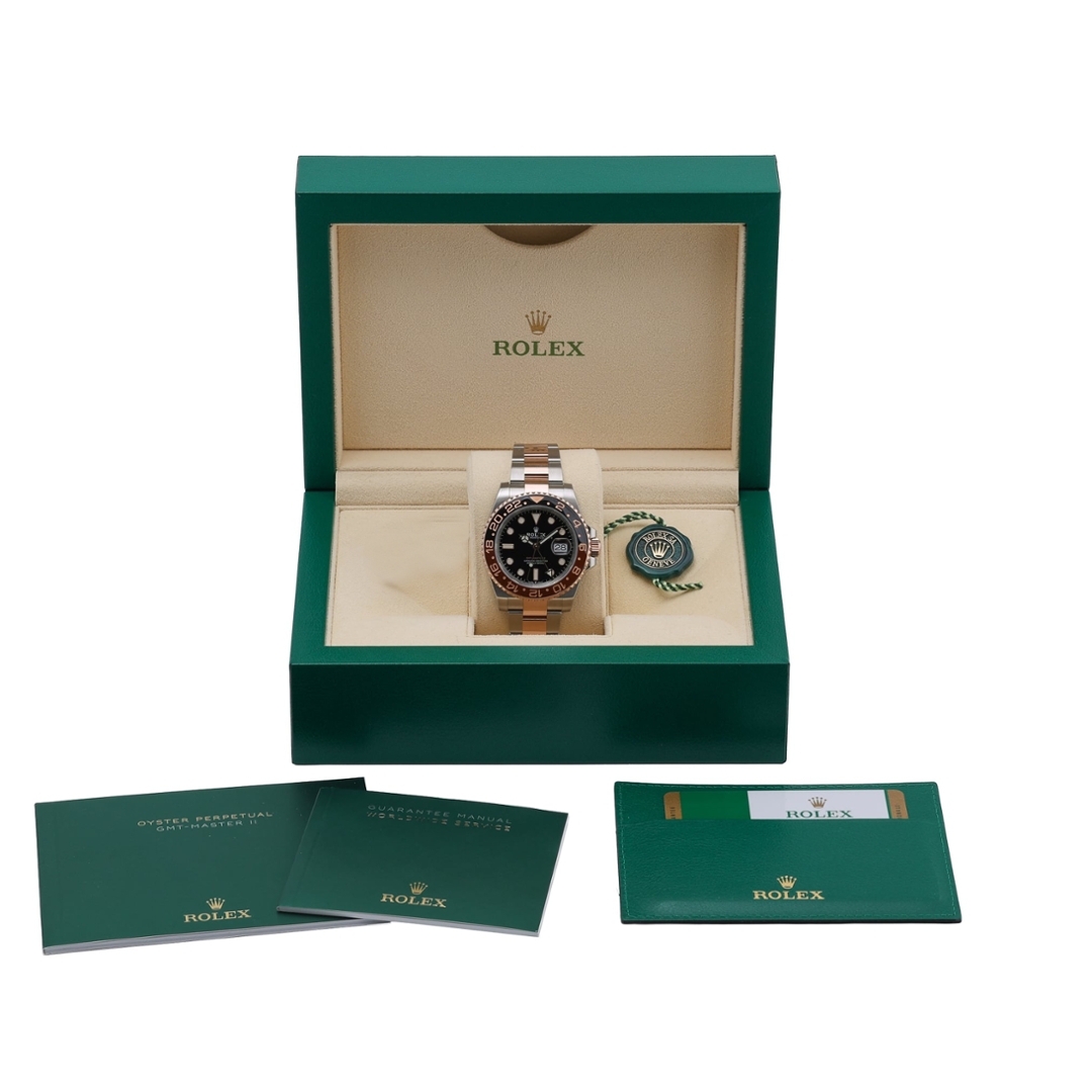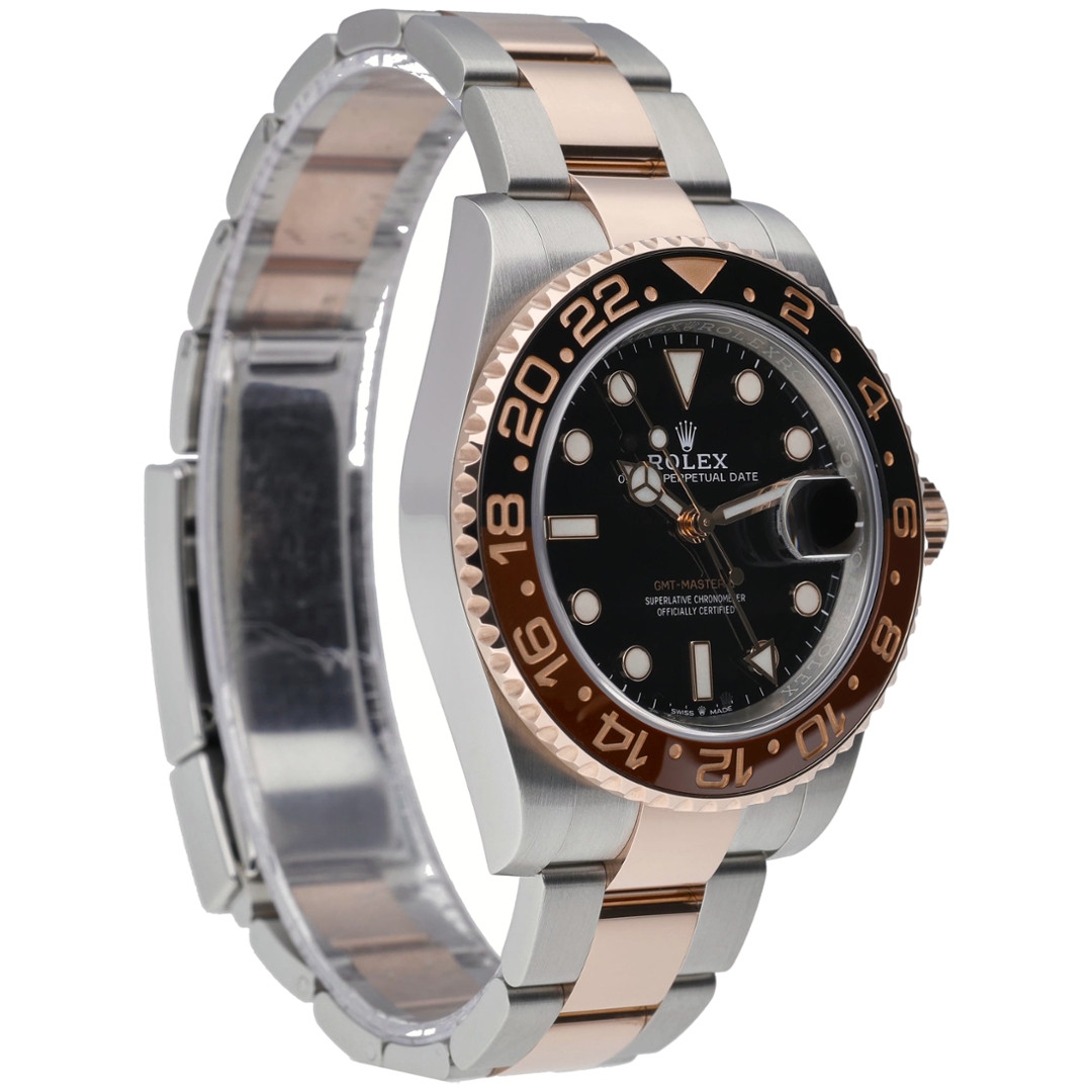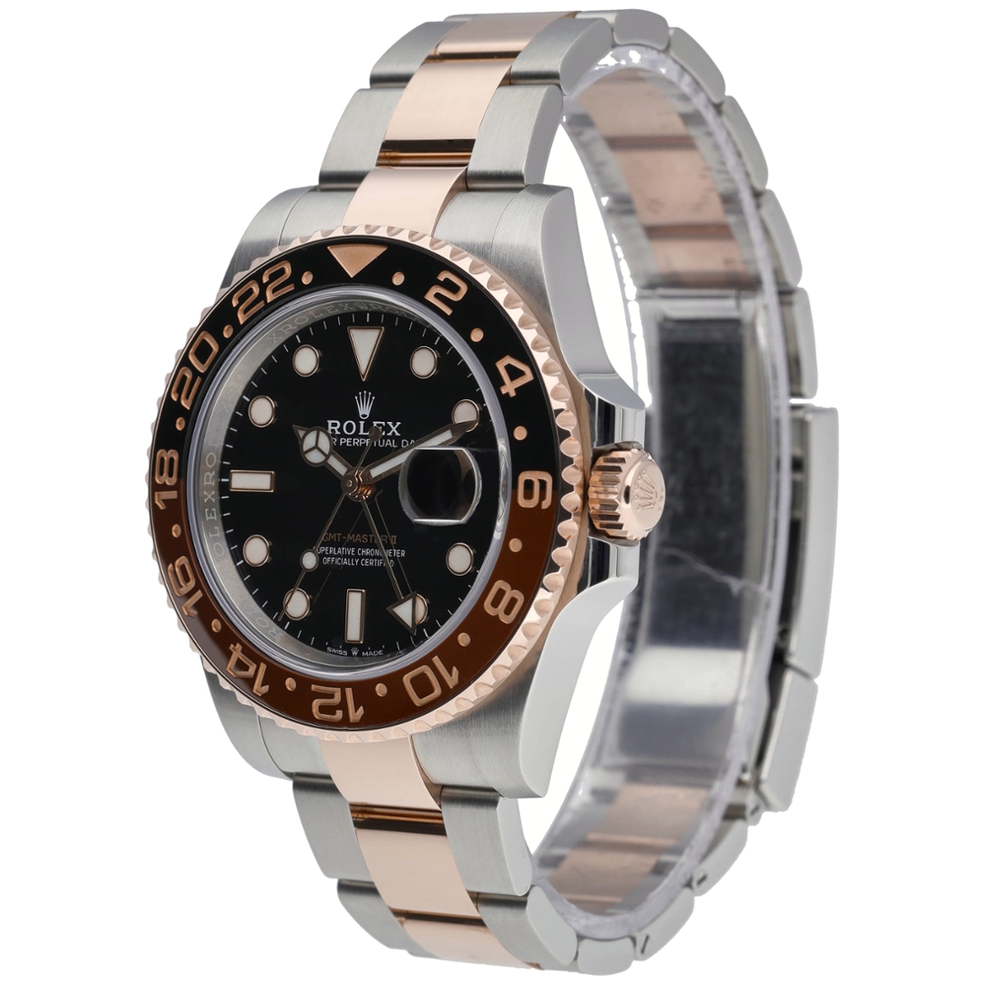 A Rolex GMT-Master II Watch, model 126711CHNR, presented in immaculate condition. This 2020 bi-metal reference is crafted from stainless steel and 18ct rose gold, featuring the distinctive black-and-brown Cerachrom bezel paired with a black dial and luminous hour markers. The 40mm case is fitted to the Oyster bracelet and powered by the Rolex Calibre 3285 automatic movement, offering dual time functionality with exceptional accuracy.