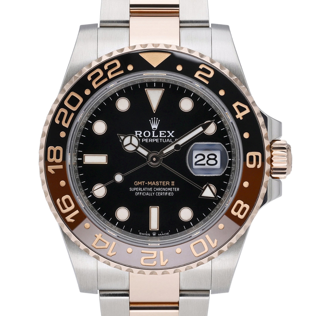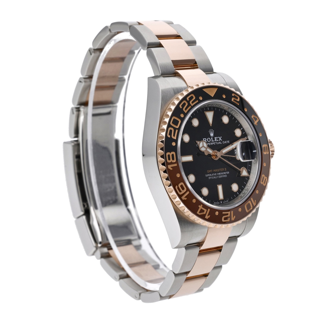 A Rolex GMT-Master II offers a refined and contemporary take on the brand’s iconic travel watch, combining stainless steel with 18ct rose gold for a distinctive bi-metal finish. The 40mm Oyster case is paired with a striking brown and black Cerachrom bezel, commonly known as the “Root Beer”, which adds warmth and depth to the overall design. A glossy black dial sits beneath, featuring luminous hour markers, Mercedes hands, and a rose gold GMT hand for clear second-time zone tracking.
