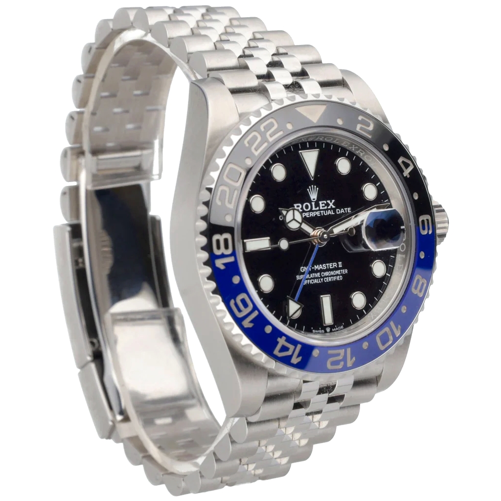 This Rolex GMT-Master II reference 126710BLNR is presented in immaculate condition, crafted in stainless steel with a 40mm Oyster case and fitted to the five-link Jubilee bracelet. The black dial is paired with the signature black-and-blue Cerachrom bezel, delivering strong visual contrast alongside applied luminous hour markers and Mercedes hands. The blue GMT hand enables clear second-time-zone tracking, reinforcing the model’s functional appeal.