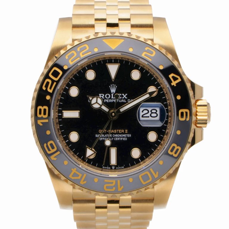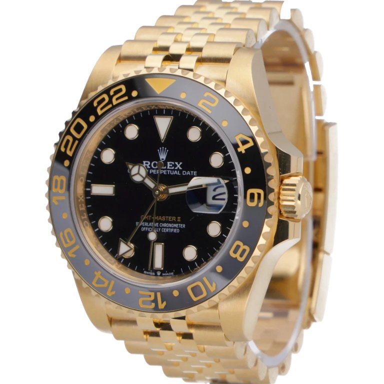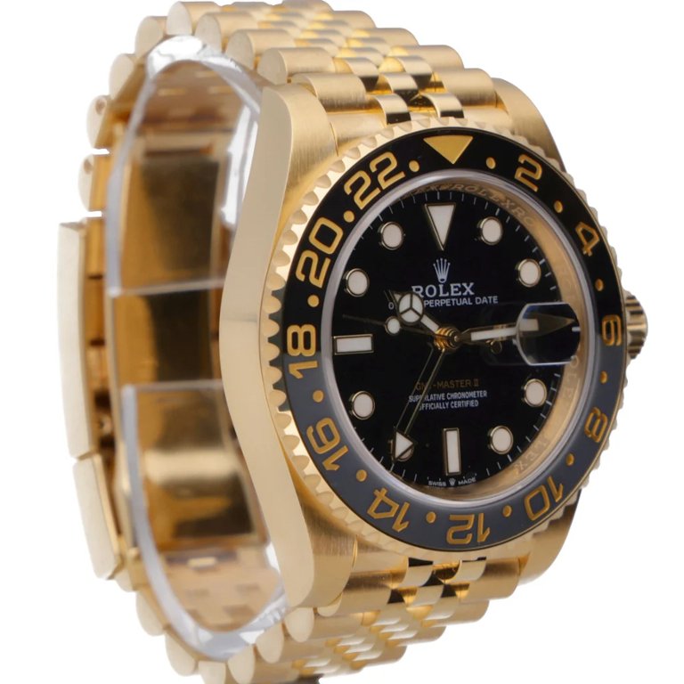 A Rolex GMT-Master II, model number 126718GRNR, is a luxurious embodiment of style and functionality, crafted entirely in 18ct yellow gold. This 2025 model stands out with its elegant 40mm case size, perfectly complemented by a striking black bezel and dial. The bezel is not just a visually appealing feature; it also serves a practical purpose, allowing simultaneous tracking of multiple time zones. This feature is invaluable for travellers and professionals alike.