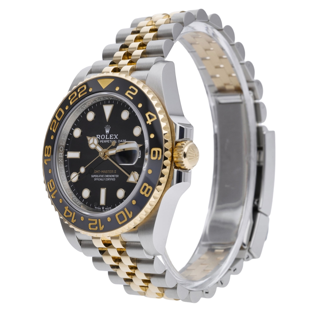 A Rolex GMT-Master II, model 126713GRNR, is a stunning bi-metal timepiece from 2023, combining the robustness of stainless steel with the luxury of 18ct yellow gold. This immaculate 40mm watch features an elegant black bezel and dial, exuding both sophistication and versatility, making it perfect for any occasion.