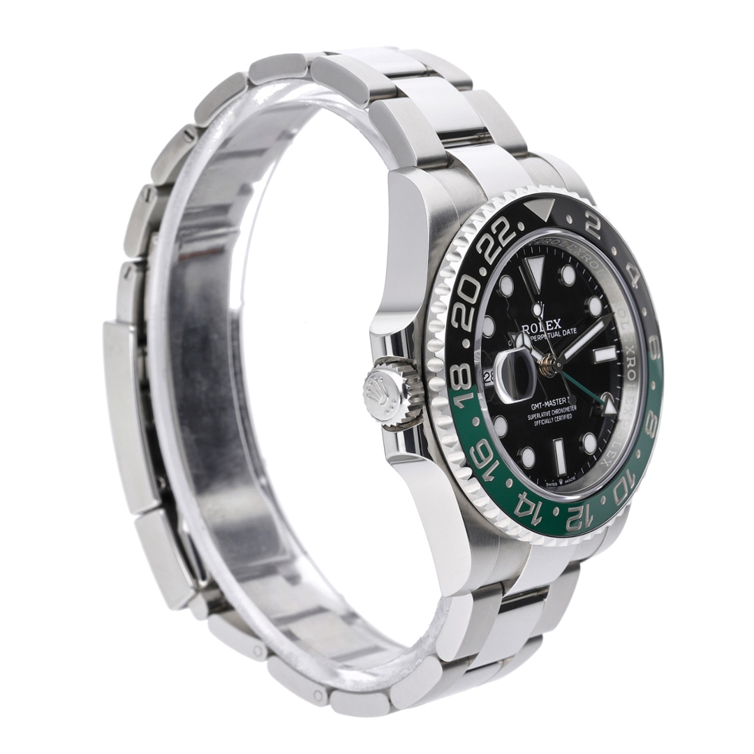 The green and black Cerachrom bezel provides striking contrast against the black dial, while the green GMT hand reinforces its dual time-zone functionality. Fitted to the Oyster bracelet, the watch maintains a sport-focused, tool-watch aesthetic with robust everyday wearability. Powering the model is the Rolex Calibre 3285 automatic movement, featuring a Chronergy escapement and an approximately 70-hour power reserve, certified to Superlative Chronometer standards.