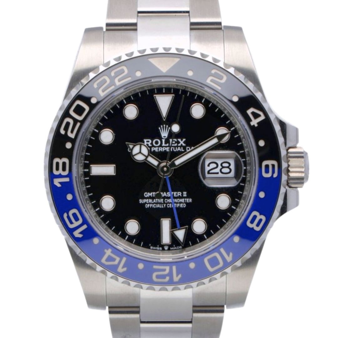 A Rolex GMT-Master II Watch in stainless steel, featuring the distinctive black and blue Cerachrom bezel paired with a classic black dial. The 40mm Oyster case delivers the robust build and clean proportions that have defined the GMT-Master line for decades, while the two-tone bezel instantly identifies this modern reference often nicknamed the “Batman”.