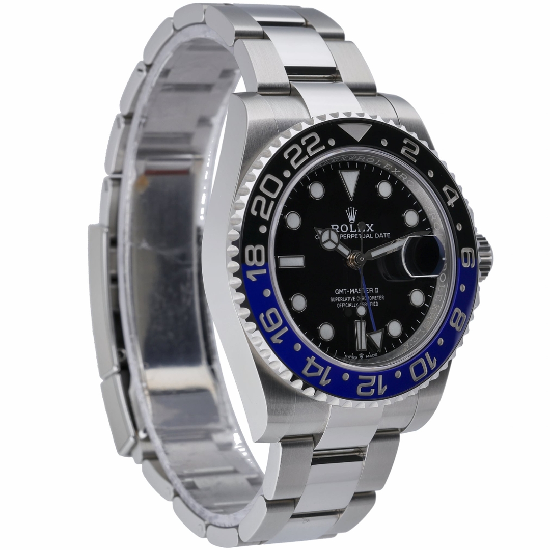 A Rolex GMT-Master II Model 126710BLNR is a modern marvel in horology, embodying the perfect blend of style and function. Released in 2022, this stunning watch features a robust stainless steel case known for its exceptional durability and classic design. The standout feature of this timepiece is its striking black-and-blue bezel, often referred to as the "Batman" bezel, which not only adds contemporary flair but also serves a practical purpose by distinguishing day from night.