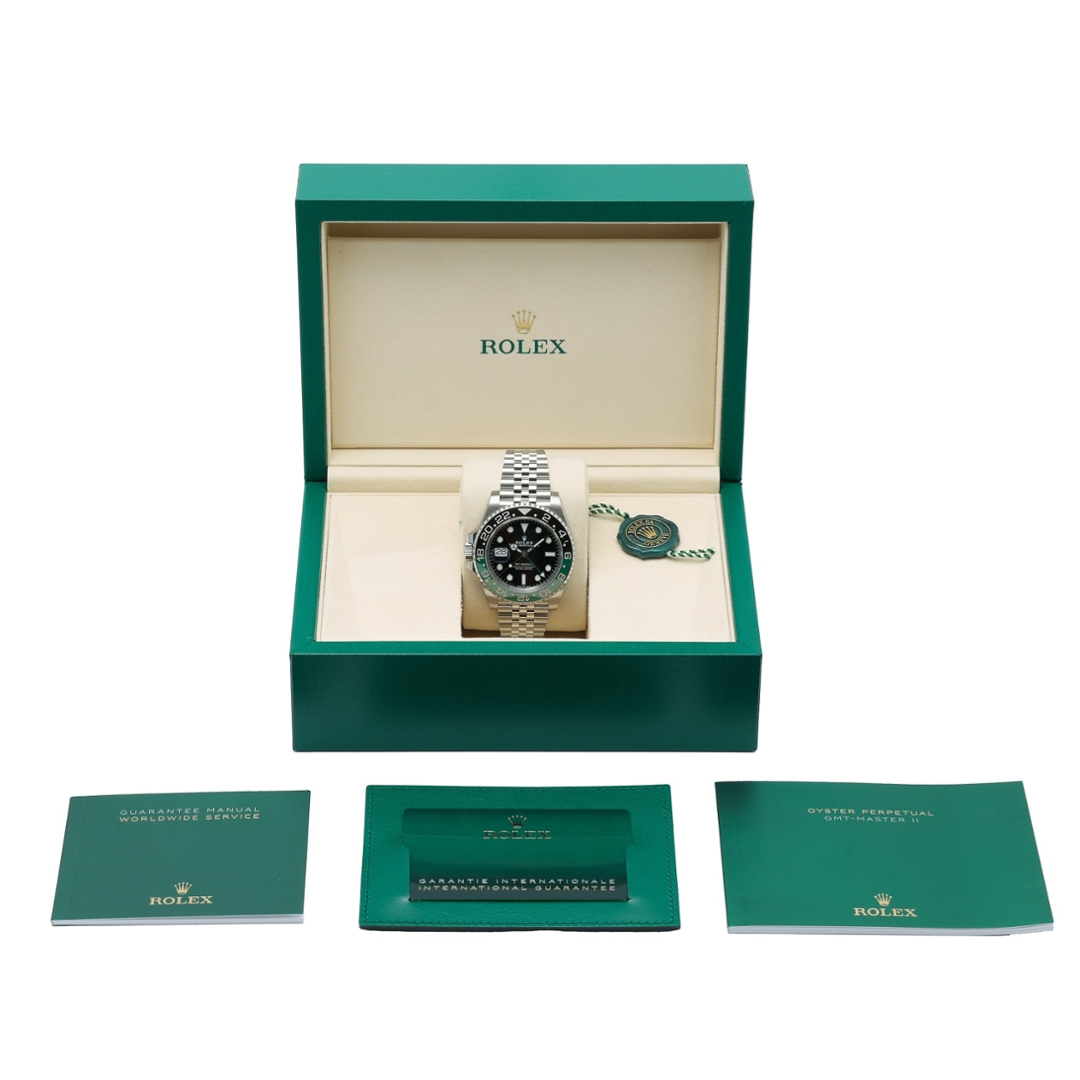 A Rolex GMT-Master II Watch, model 126720VTNR, crafted in stainless steel with a striking green and black Cerachrom bezel and a sleek black dial. Known as the “Sprite” among collectors, this 40mm model features the signature left-hand crown position — a bold departure from traditional GMT models — and is powered by Rolex’s advanced calibre 3285 automatic movement offering a 70-hour power reserve and dual time zone functionality.