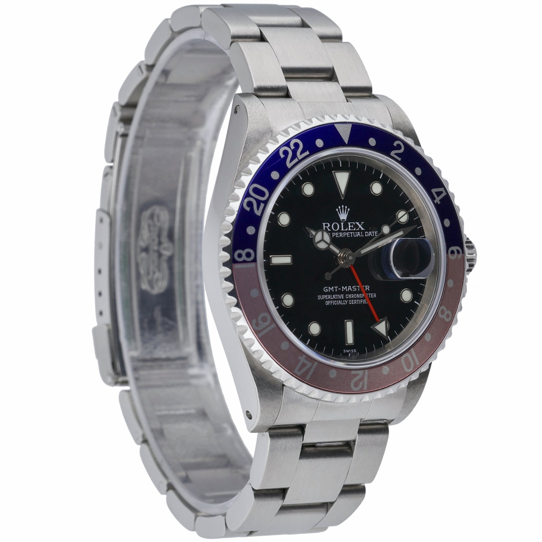 A Rolex GMT-Master Watch, Stainless Steel with a Blue/Red Bezel and a Black Dial.