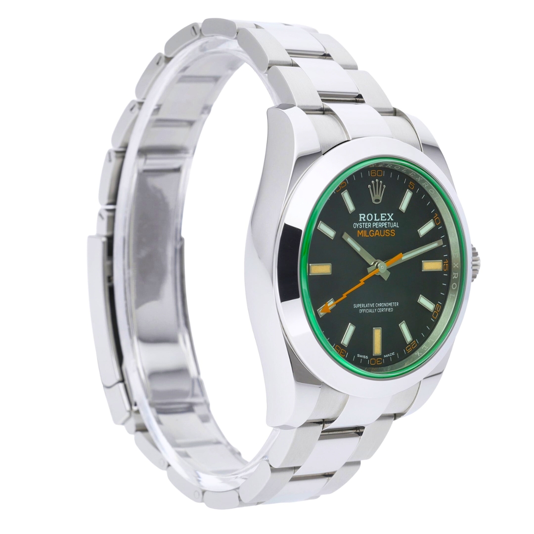 A Rolex Milgauss Watch that celebrates the perfect harmony of scientific innovation and striking design. Crafted from durable stainless steel, this model features the distinctive black dial enhanced by vivid orange accents and the signature lightning bolt seconds hand—a tribute to the model’s heritage as the engineer’s watch. The green-tinted sapphire crystal, unique to the Milgauss, adds a captivating visual depth while maintaining Rolex’s legendary scratch resistance and clarity.