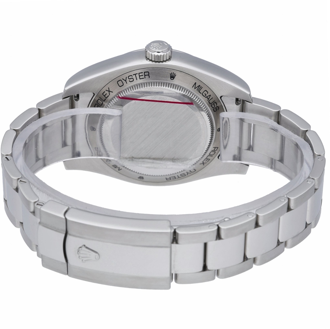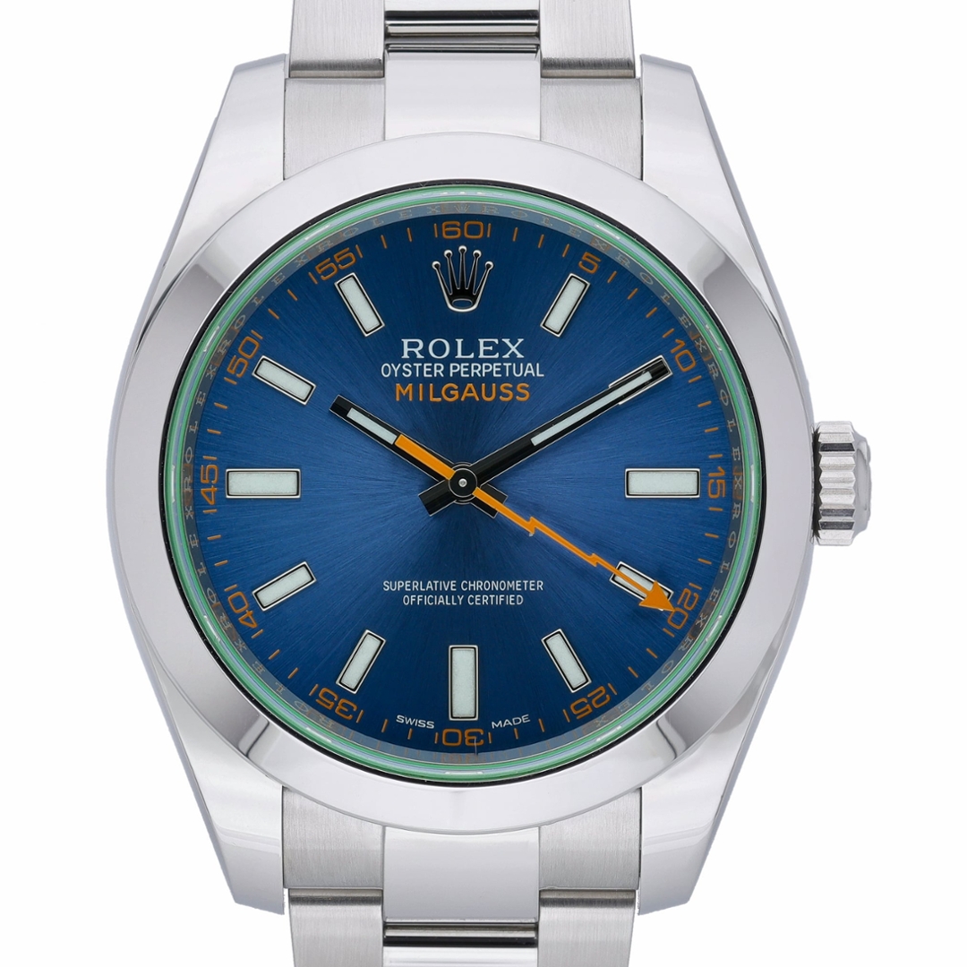 Equipped with an automatic movement, the Milgauss 116400GV ensures accurate timekeeping while offering resistance to magnetic interference, a feature particularly beneficial in environments with prevalent electromagnetic fields. Its blue dial, accentuated by luminous hour markers and hands, enhances readability and adds a touch of flair to its design.