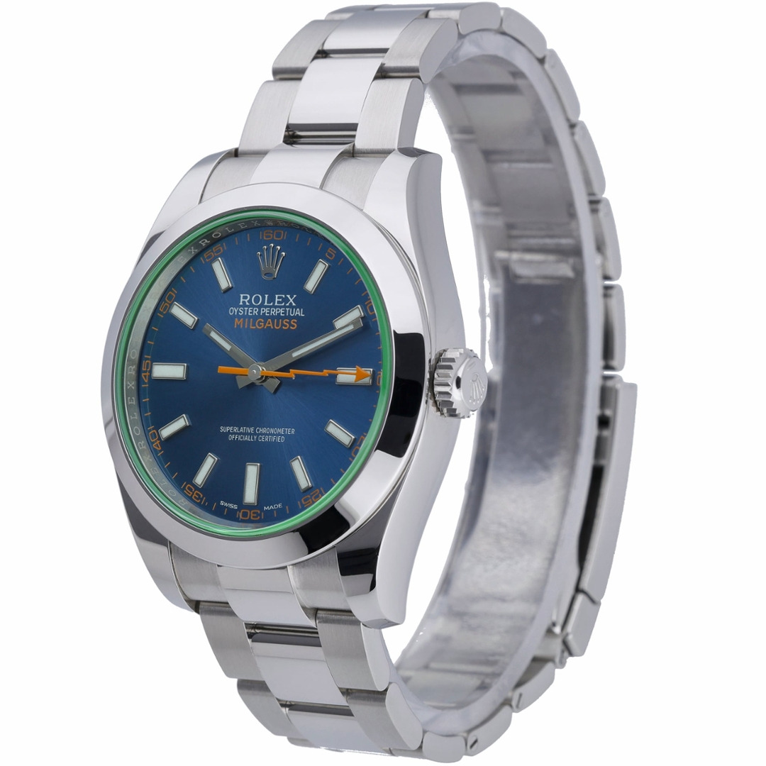 A Rolex Milgauss reference 116400GV, produced in 2016, is a testament to Rolex's dedication to precision and innovation in watchmaking. This model, distinguished by its stainless steel construction and captivating blue dial, stands out as a symbol of sophistication and technical prowess. The 40mm case size strikes a perfect balance between wrist presence and everyday wearability, making it a versatile timepiece suited to various occasions.