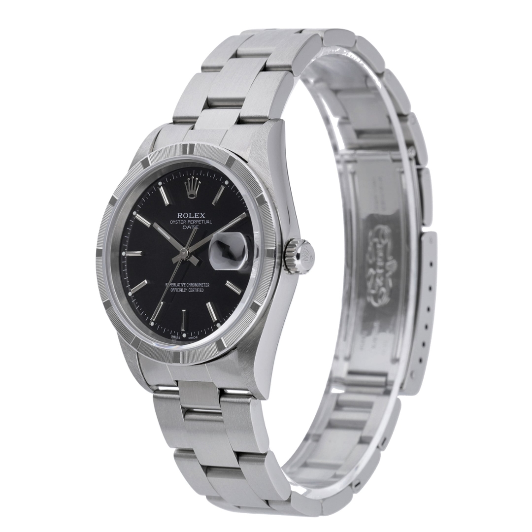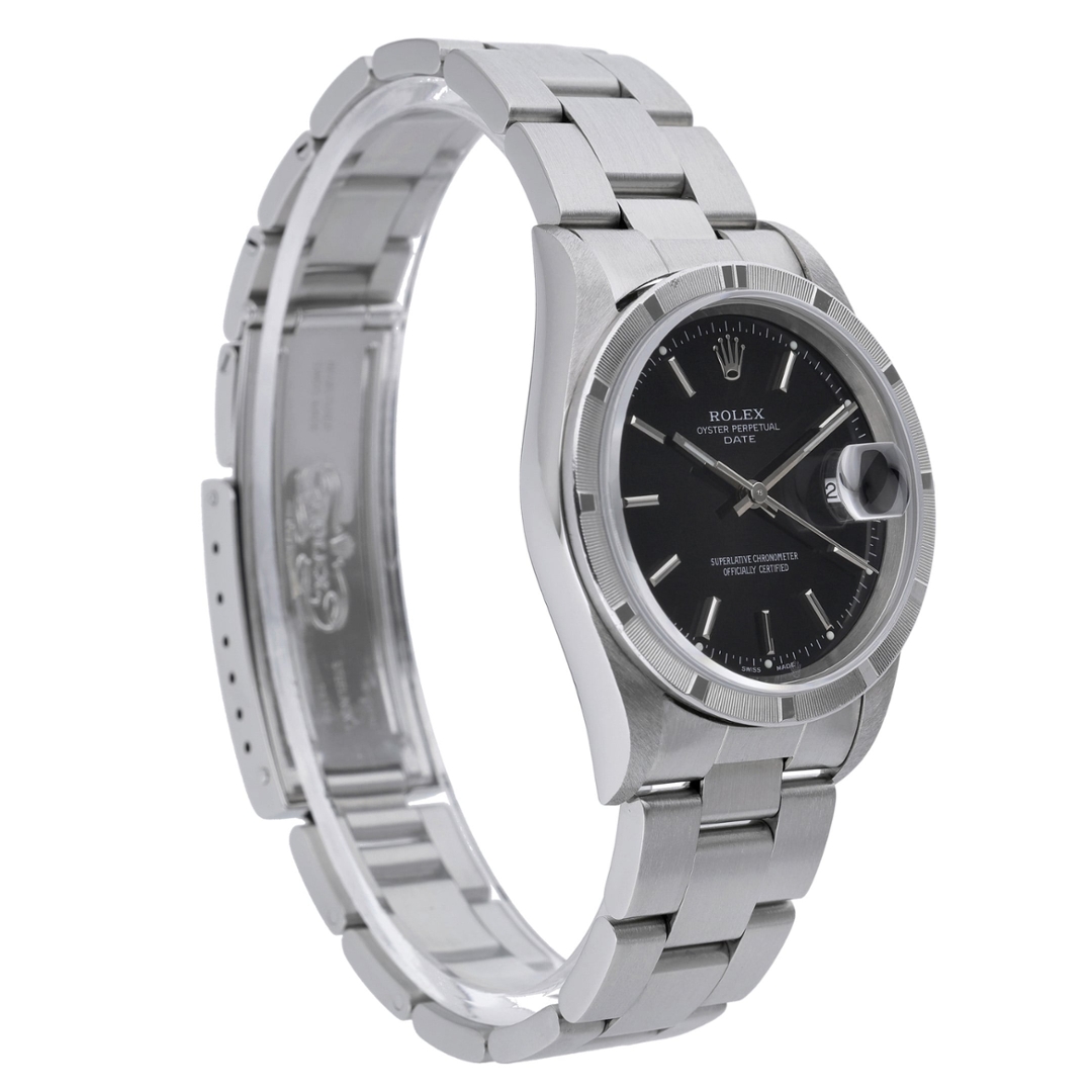 A Rolex Oyster Perpetual Date Watch in stainless steel, featuring the classic black dial that highlights the understated elegance of this versatile Rolex model. The 34mm Oyster case delivers balanced proportions that sit comfortably on the wrist, while the engine-turned bezel adds a distinctive textured detail that sets this reference apart from more traditional smooth or fluted designs.