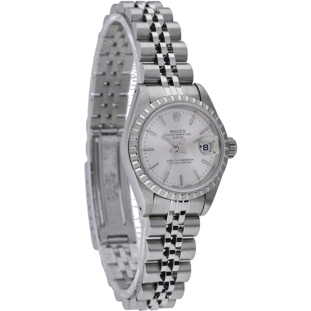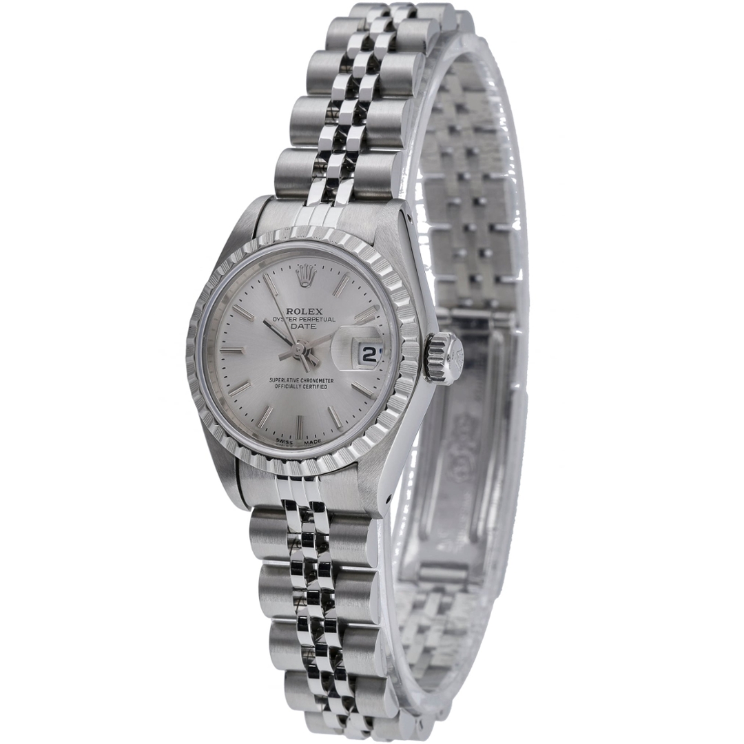 A Rolex Oyster Perpetual Date presented in stainless steel with a silver sunburst dial, featuring applied baton hour markers and matching hands. The 26mm Oyster case offers a refined and timeless profile, complemented by a date display at 3 o’clock with the signature Cyclops lens for enhanced legibility. The clean dial layout and classic proportions make this an elegant and versatile choice within the Rolex range.