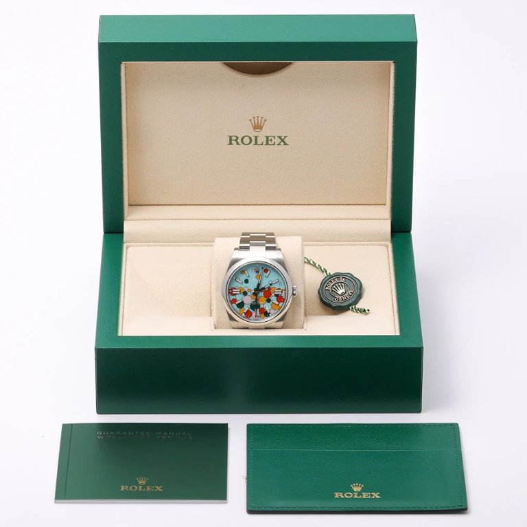 The dial of the Rolex Oyster Perpetual is a mesmerising canvas, adorned with a vibrant Turquoise Blue Celebration Motif that captivates the eye with its dynamic and celebratory design. Reminiscent of confetti scattered against a clear blue sky, the motif evokes feelings of joy and excitement, making it the perfect companion for life's most memorable moments. This unique dial serves as a testament to Rolex's commitment to innovation and creativity, pushing the boundaries of traditional watchmaking to create something truly extraordinary.