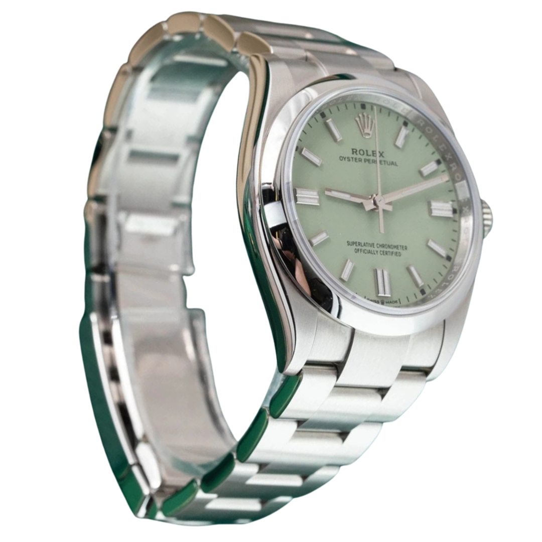 A Rolex Oyster Perpetual Watch in stainless steel, featuring a smooth bezel and fitted to a classic Oyster bracelet. This 2025 reference 126000 model is housed in a 36mm case and showcases a pistachio dial with applied baton hour markers—a sought-after variation in the current Oyster Perpetual lineup.