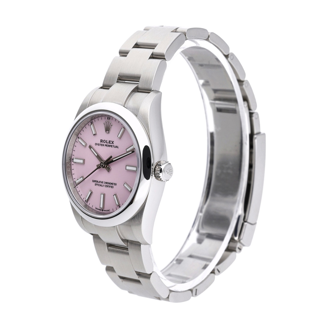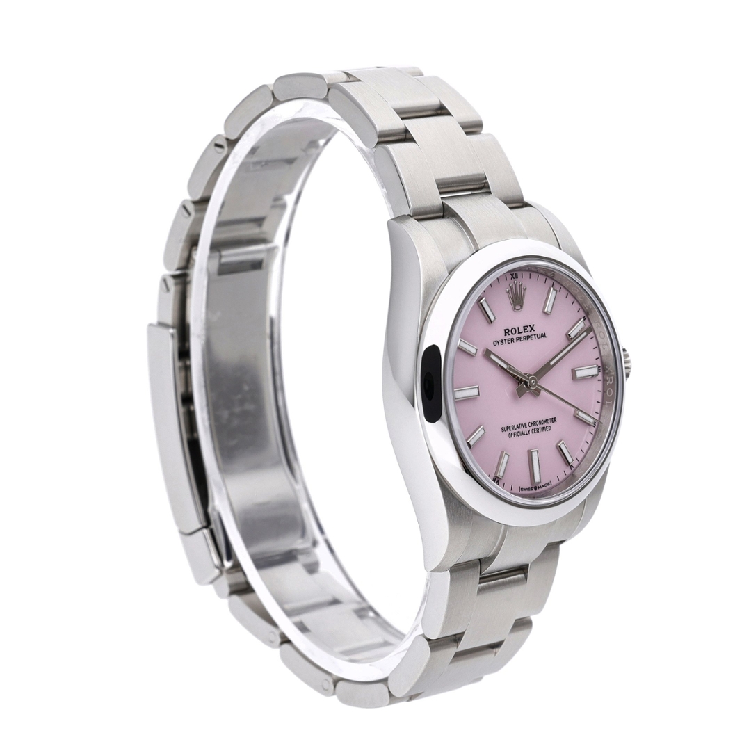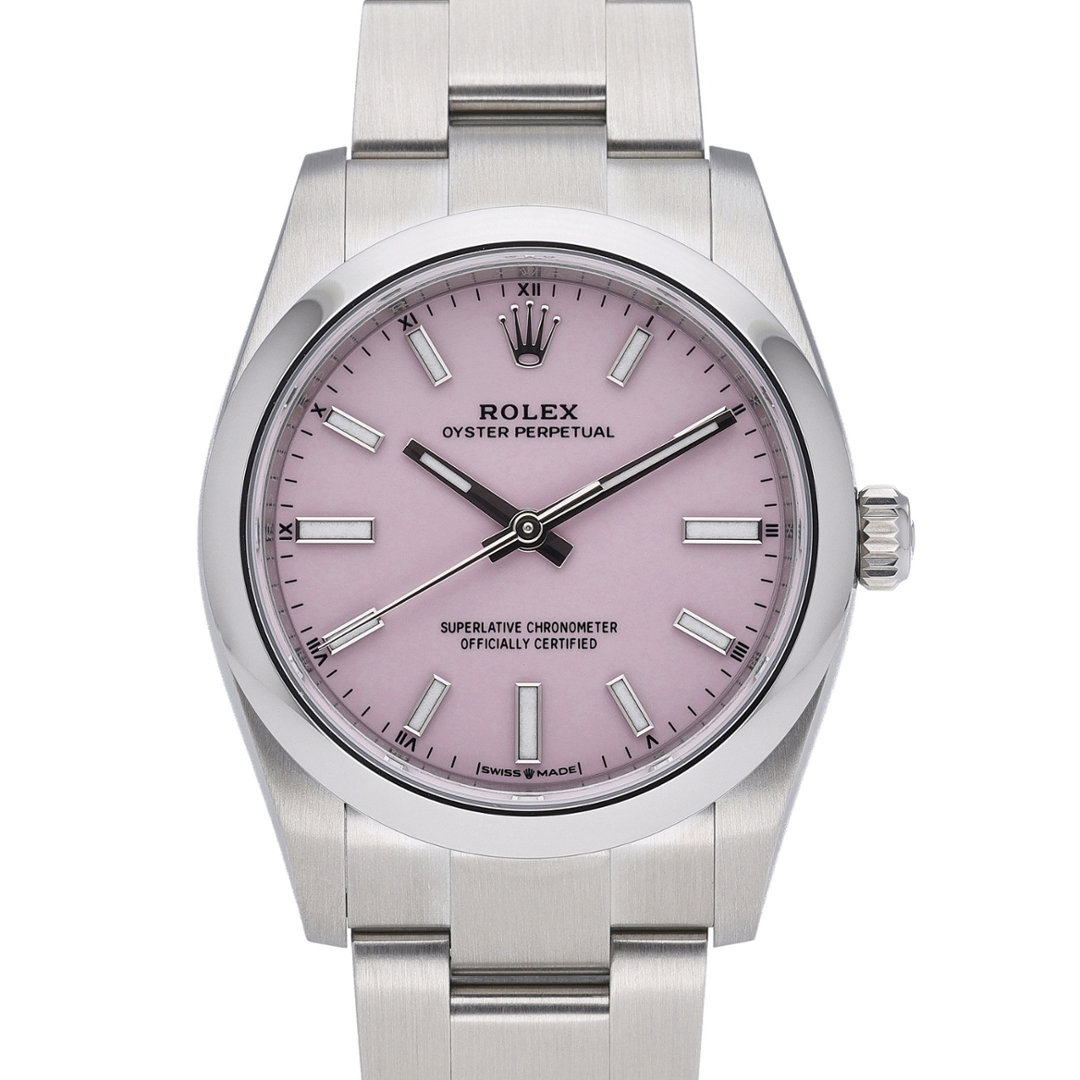 A Rolex Oyster Perpetual Watch in stainless steel, fitted with a smooth bezel and classic Oyster bracelet. This 2025 reference 124200 features a 34mm case and a pink dial with applied baton hour markers.