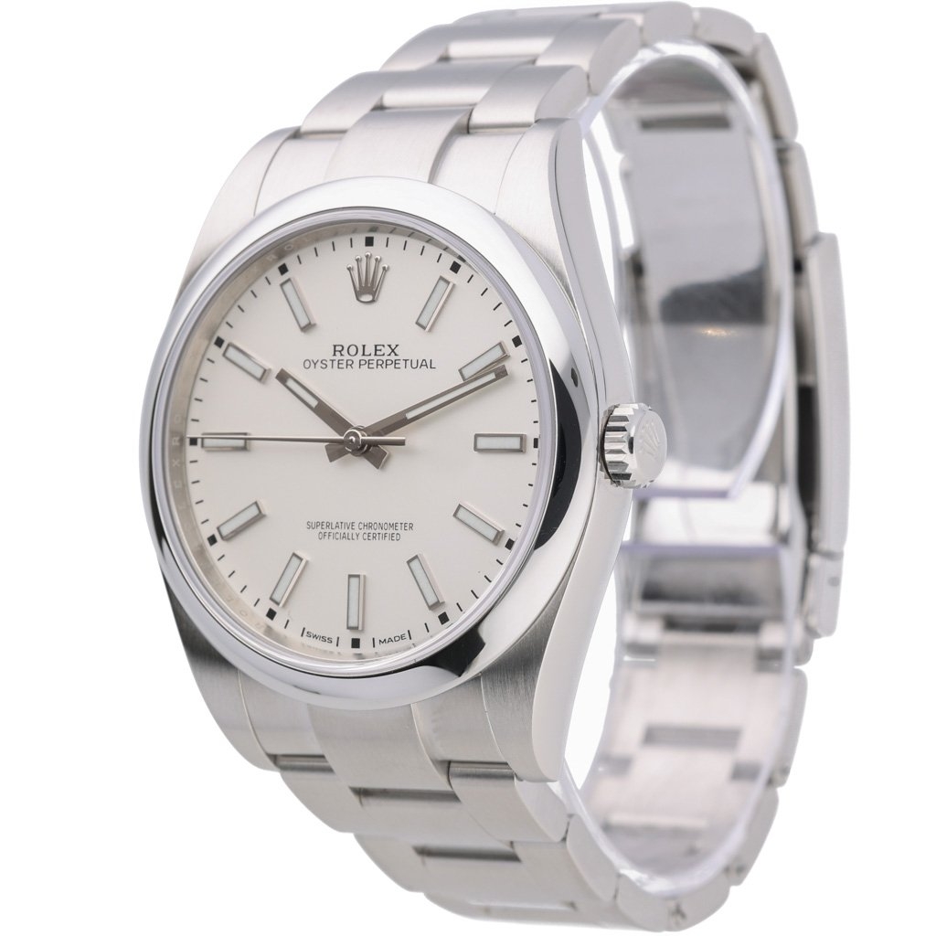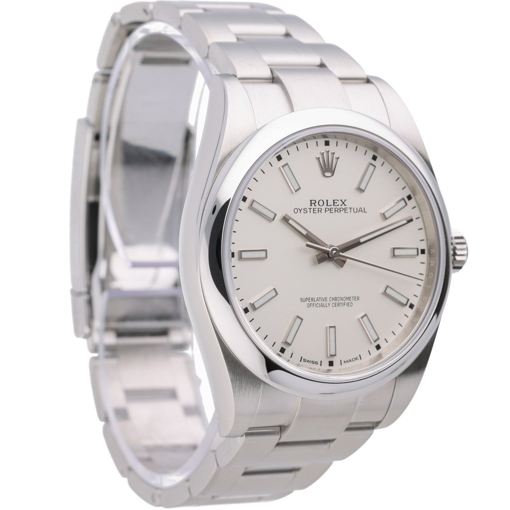 A Rolex Oyster Perpetual 114300 is a stunning example of Rolex's commitment to timeless elegance and precision. Introduced in 2019, this model stands out with its 39mm stainless steel case, offering a sophisticated, versatile size that complements both casual and formal attire. The watch features a pristine white dial with a classic, clean aesthetic, enhanced by luminous hour markers and hands, ensuring readability in various lighting conditions.
