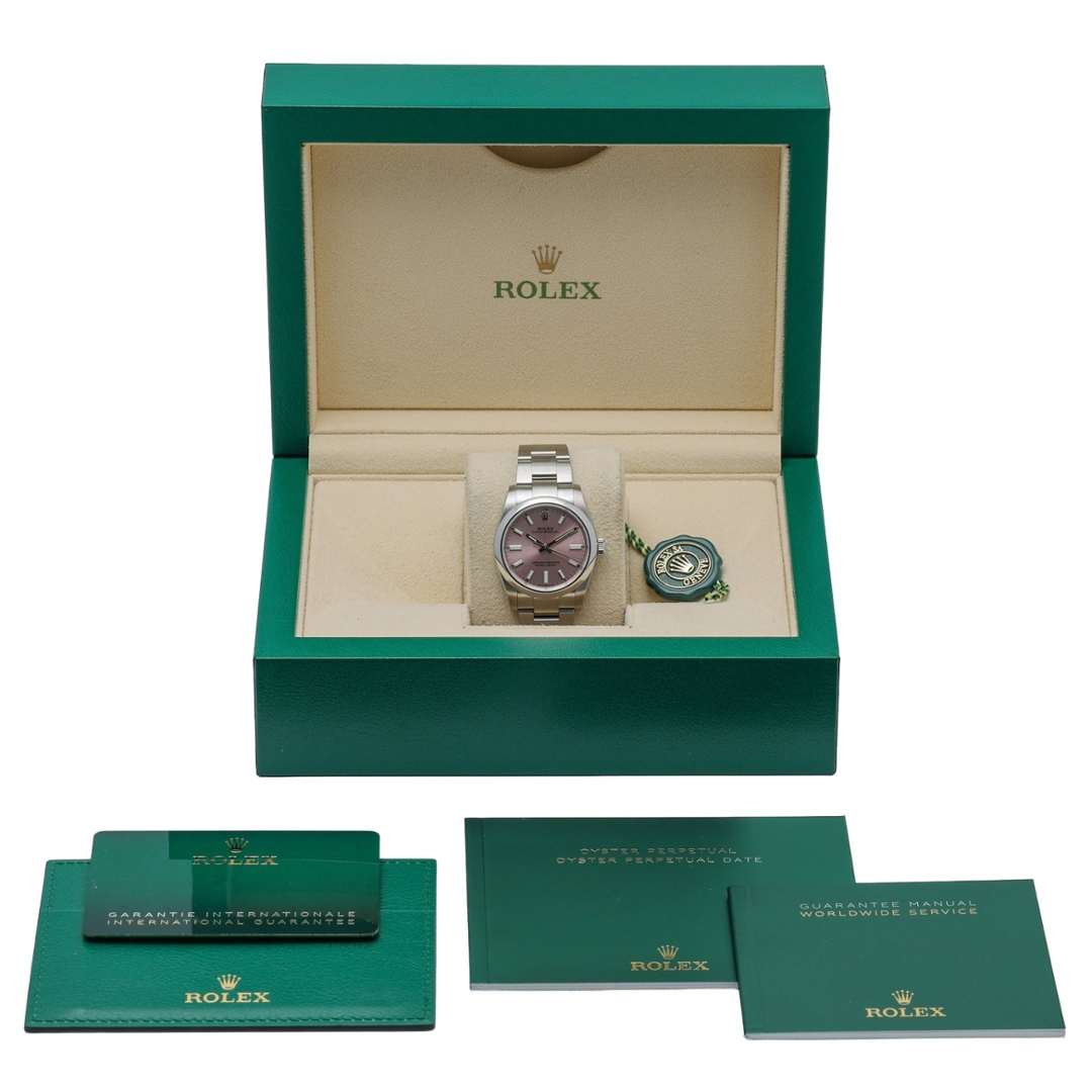 Dated 2022 and presented in immaculate condition, this example comes complete with its original Rolex box, full set of paperwork, and certification. Backed by the Rolex manufacturer's warranty until 2027, it offers complete assurance and lasting value. The Rolex Oyster Perpetual 34, with its pink dial, perfectly captures the essence of modern luxury — a pure, elegant classic built to stand the test of time.