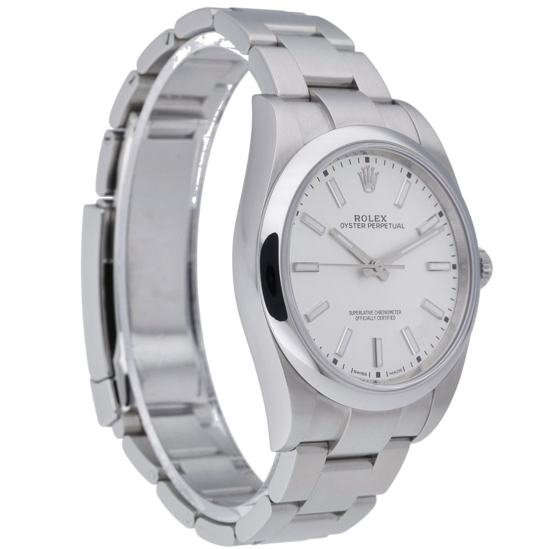 A Rolex Oyster Perpetual 114300 is a stunning example of Rolex's commitment to timeless elegance and precision. Introduced in 2019, this model stands out with its 39mm stainless steel case, offering a sophisticated, versatile size that complements both casual and formal attire. The watch features a pristine white dial with a classic, clean aesthetic, enhanced by luminous hour markers and hands, ensuring readability in various lighting conditions.
