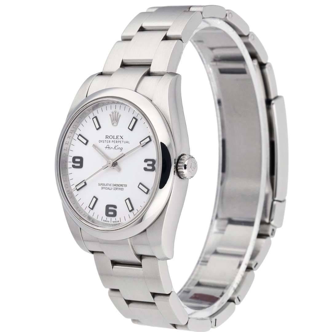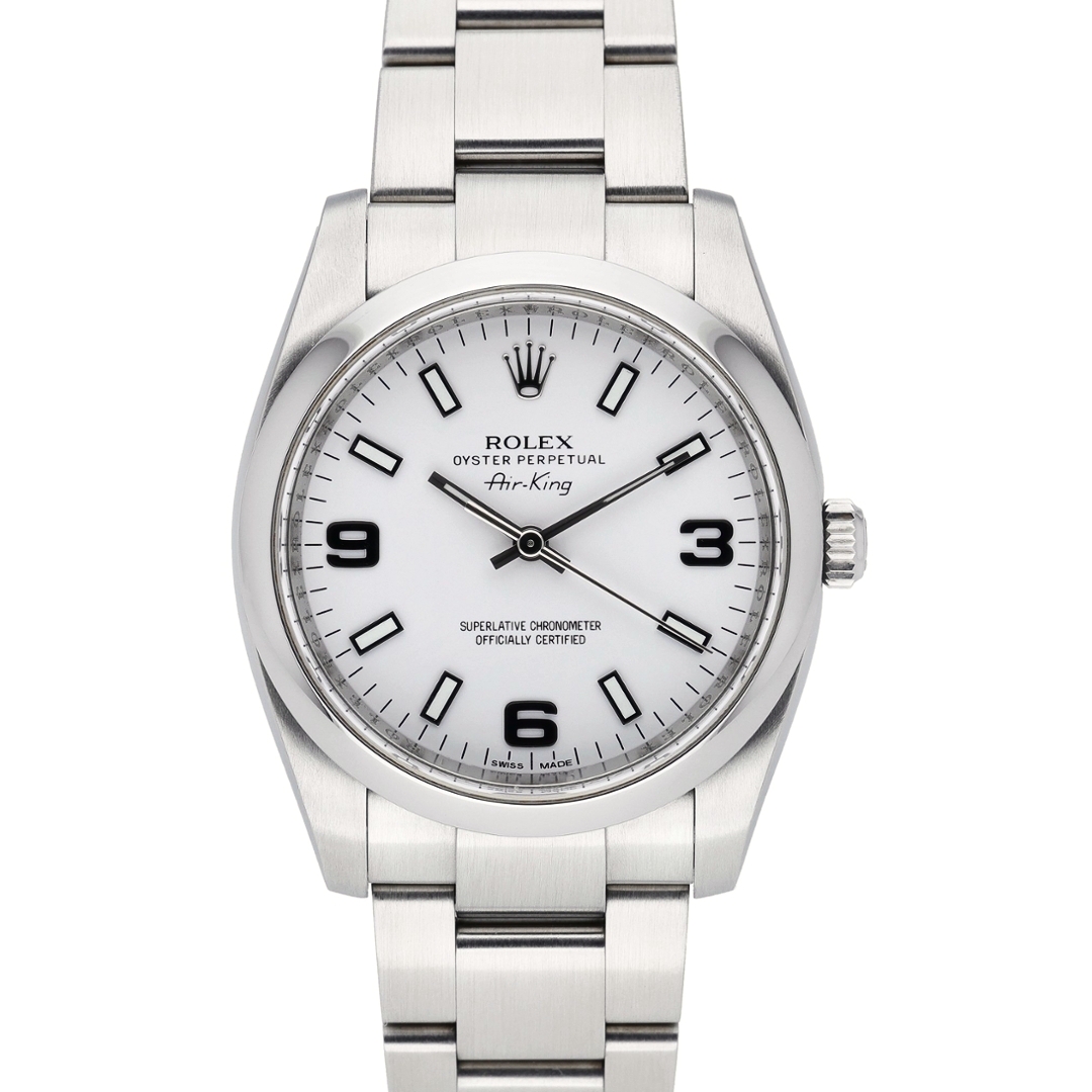 A Rolex Air-King 114200, crafted entirely from stainless steel and featuring a crisp white dial, offers timeless simplicity and refined sportiness in one of Rolex’s most understated designs. The 34mm Oyster case provides perfect proportions for both men and women, embodying the versatility and balance that define the Air-King collection.