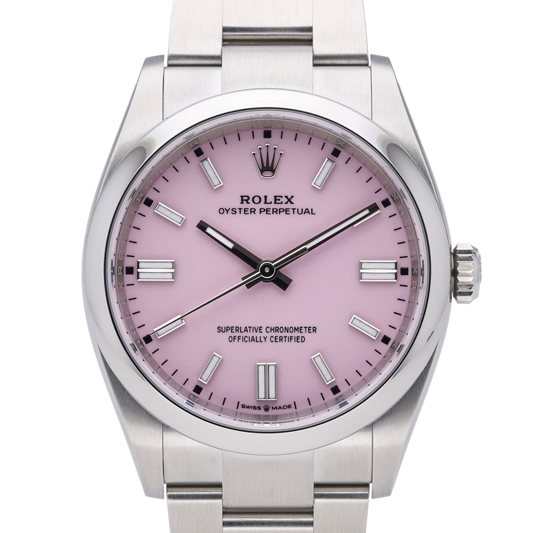 A Rolex Oyster Perpetual Watch in stainless steel, featuring a smooth bezel and fitted to a classic Oyster bracelet. This 2025 reference 126000 model is housed in a 36mm case and showcases a distinctive pink dial with applied baton hour markers—a vibrant and sought-after variation in the current Oyster Perpetual lineup.
