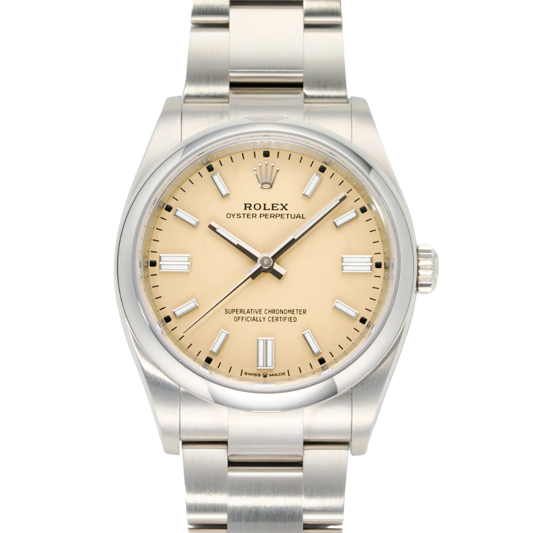 A Rolex Oyster Perpetual Watch in stainless steel, presented with a smooth bezel and a refined beige dial that brings a warm, contemporary twist to one of Rolex’s most timeless designs. The 31mm case offers a balanced and versatile profile, paired with classic baton hour markers and the signature Oyster bracelet for everyday comfort and durability.