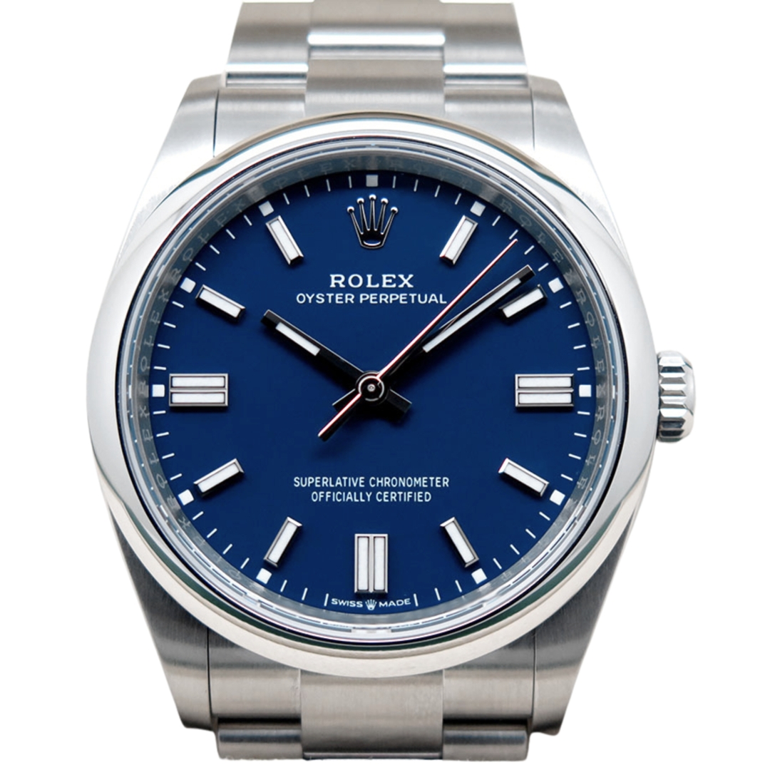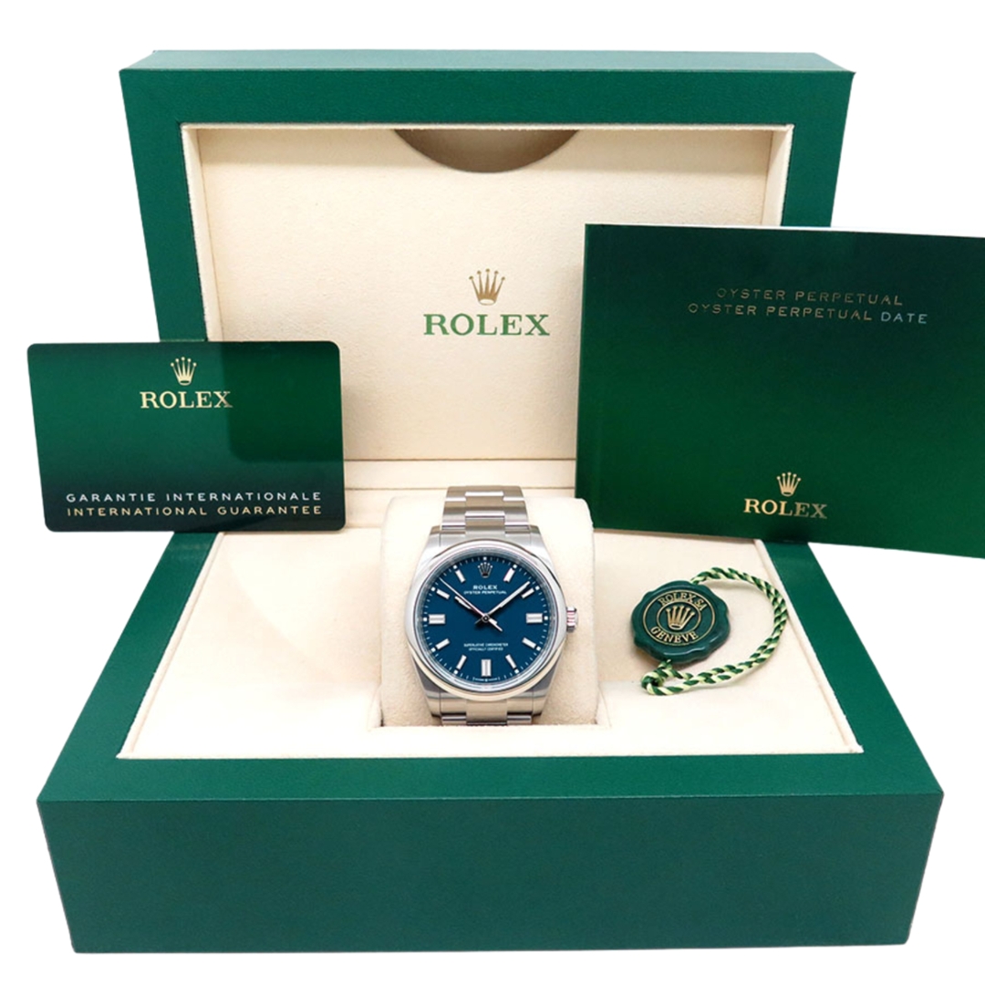 Presented in immaculate condition, this 2026 model includes its original Rolex box, full set of paperwork, and the manufacturer's warranty valid until 2031. The Rolex Oyster Perpetual 126000 in medium blue embodies understated luxury, technical mastery, and the enduring prestige that has defined the Rolex name for generations.